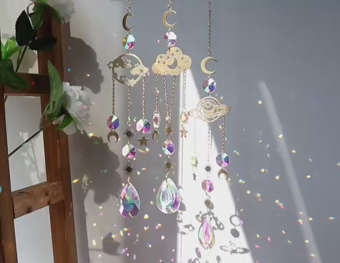 Illuminate your space with the celestial magic and radiant beauty of the Crystal Sun Catcher Wind Chimes. Let the star, moon, and diamond prisms create a captivating display of light and color, filling your home and garden with a touch of celestial enchantment. Experience the emotional attachment and sense of wonder that comes from witnessing the ethereal dance. Whether for personal indulgence or as a meaningful gift, these wind chimes are perfect for those who seek to embrace celestial symbolism and create a harmonious ambiance. Order yours today and let the celestial magic unfold.