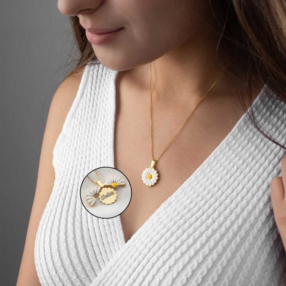 Introducing our exquisite Daisy Flower Pendant Custom Engraved Name Necklace, a stunning piece of stainless steel jewelry that makes for a perfect personalized Mother's Day gift. This necklace combines the beauty of a daisy flower pendant with customizable name engraving, creating a truly special and sentimental accessory for women.