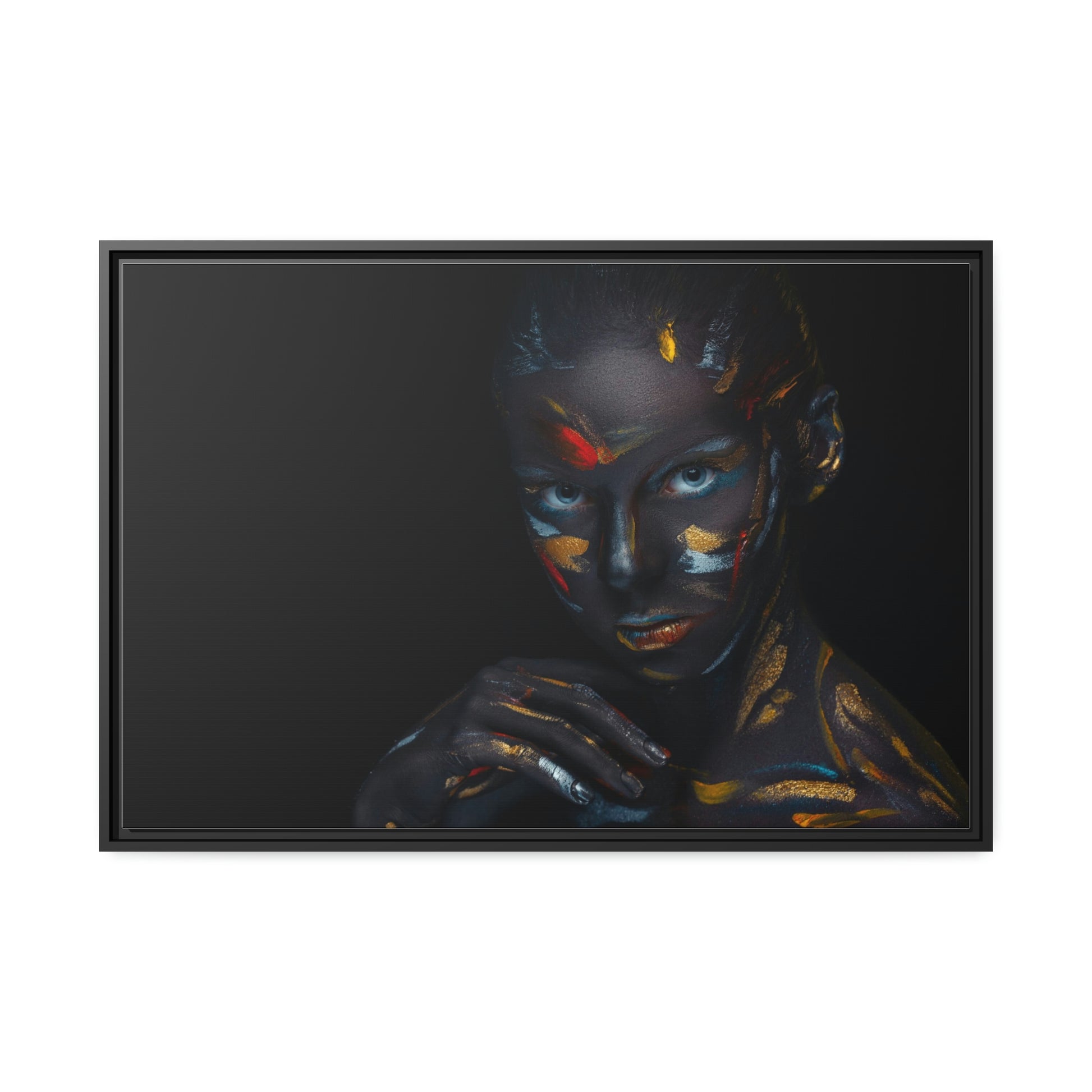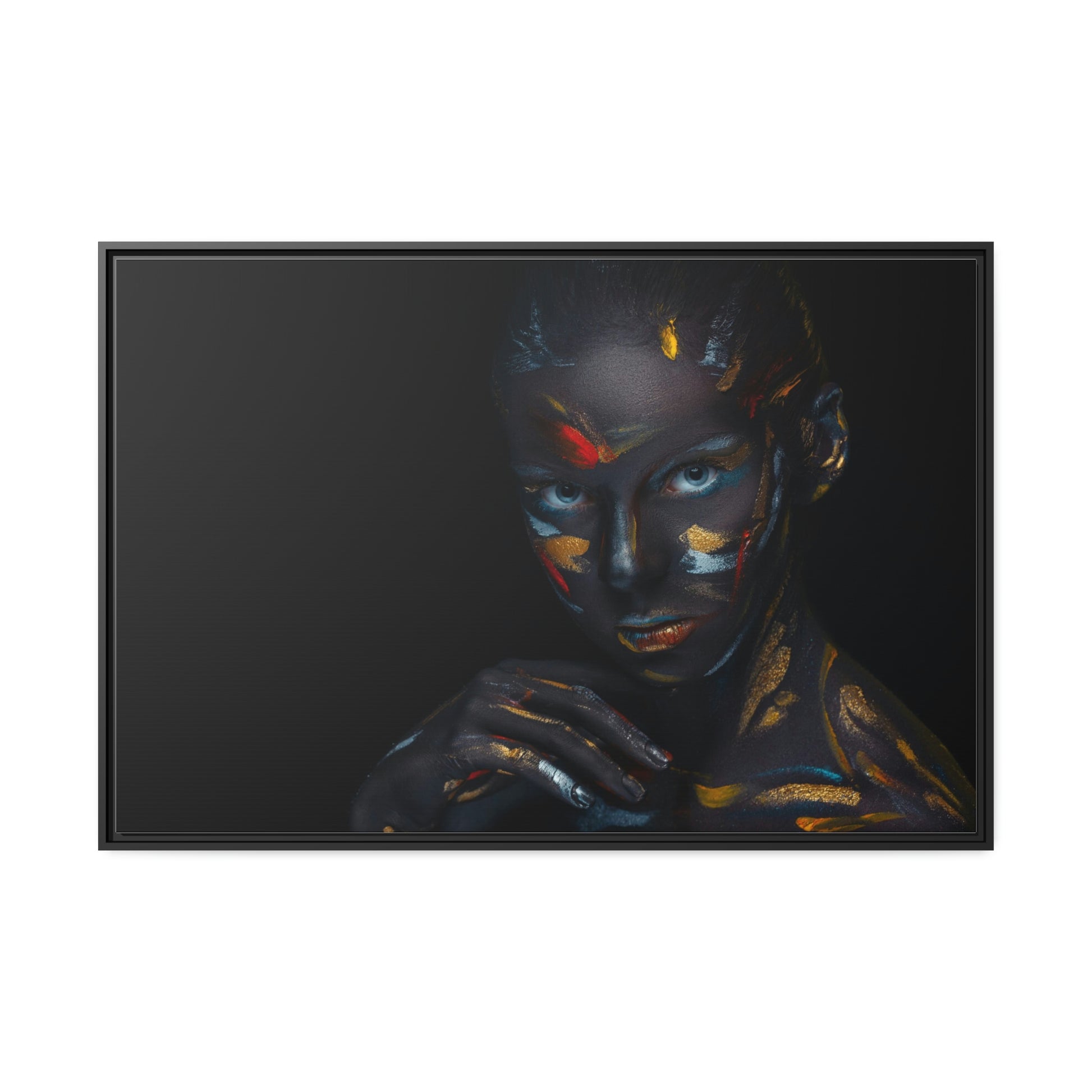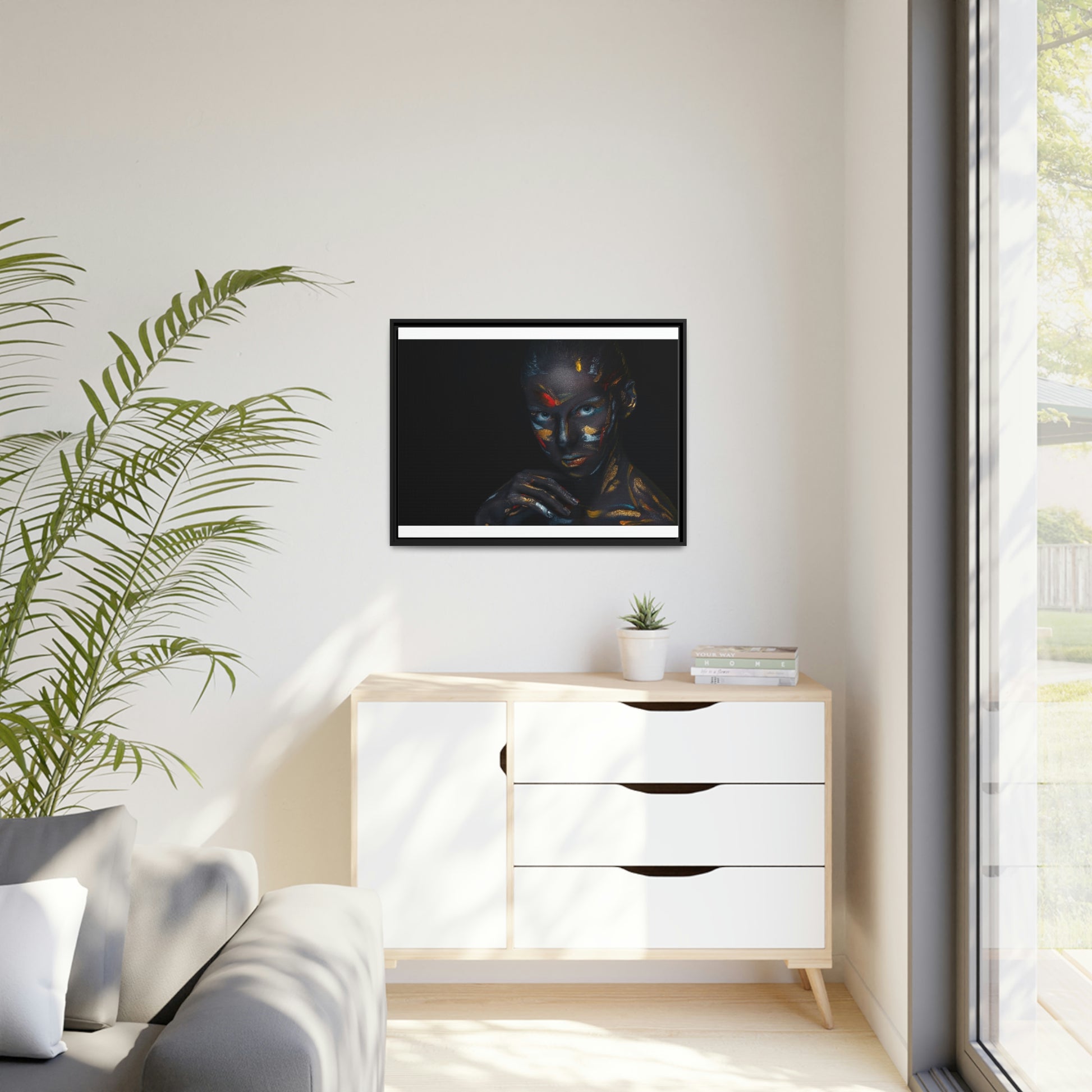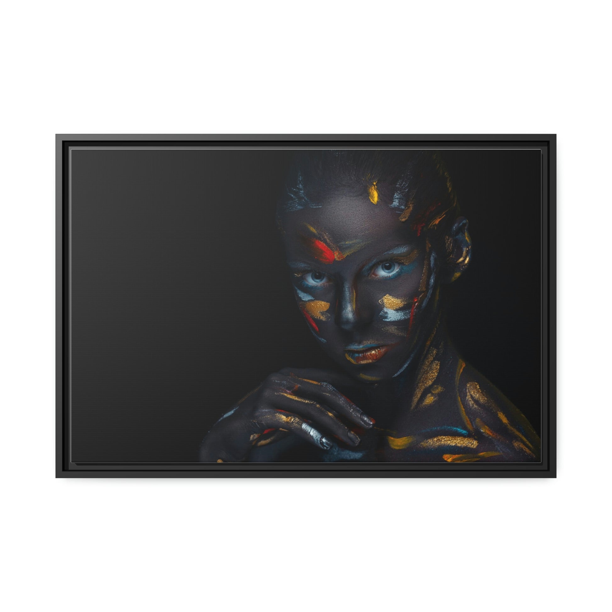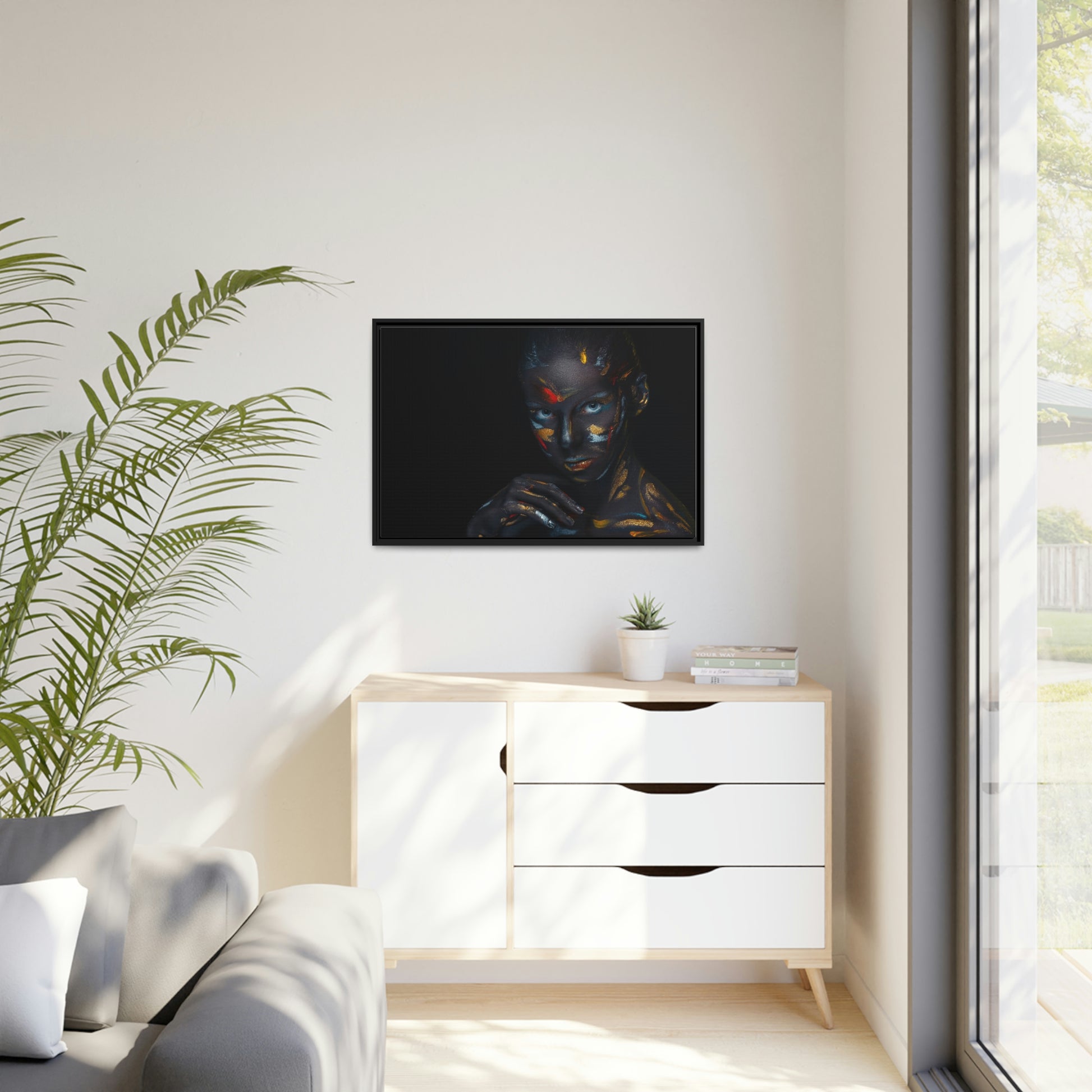 Transform any room into an artistic space with this stunning Framed Canvas Photo Portrait titled "Inky Enigma". This unique piece of Wall Art features a young woman posing elegantly, yet mysteriously, covered in black paint. Her piercing gaze draws you into the image, leaving you captivated by her enigmatic aura.