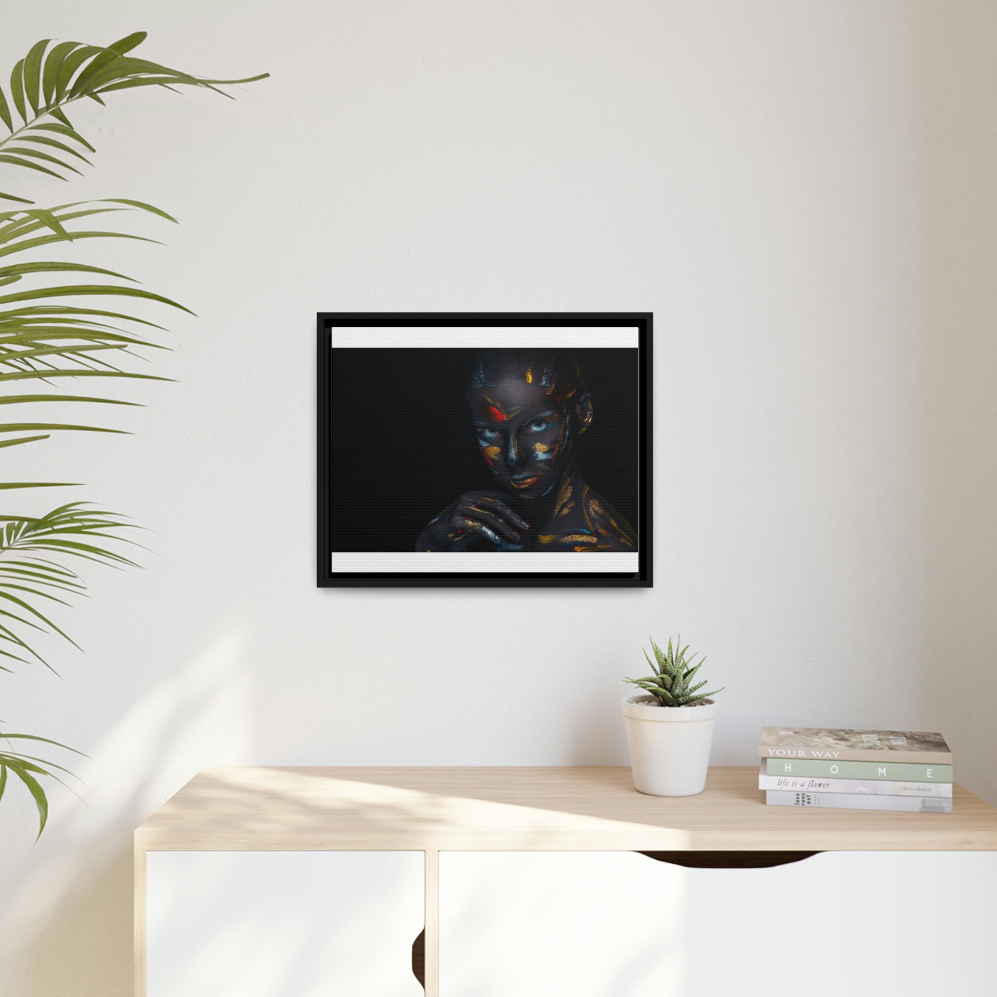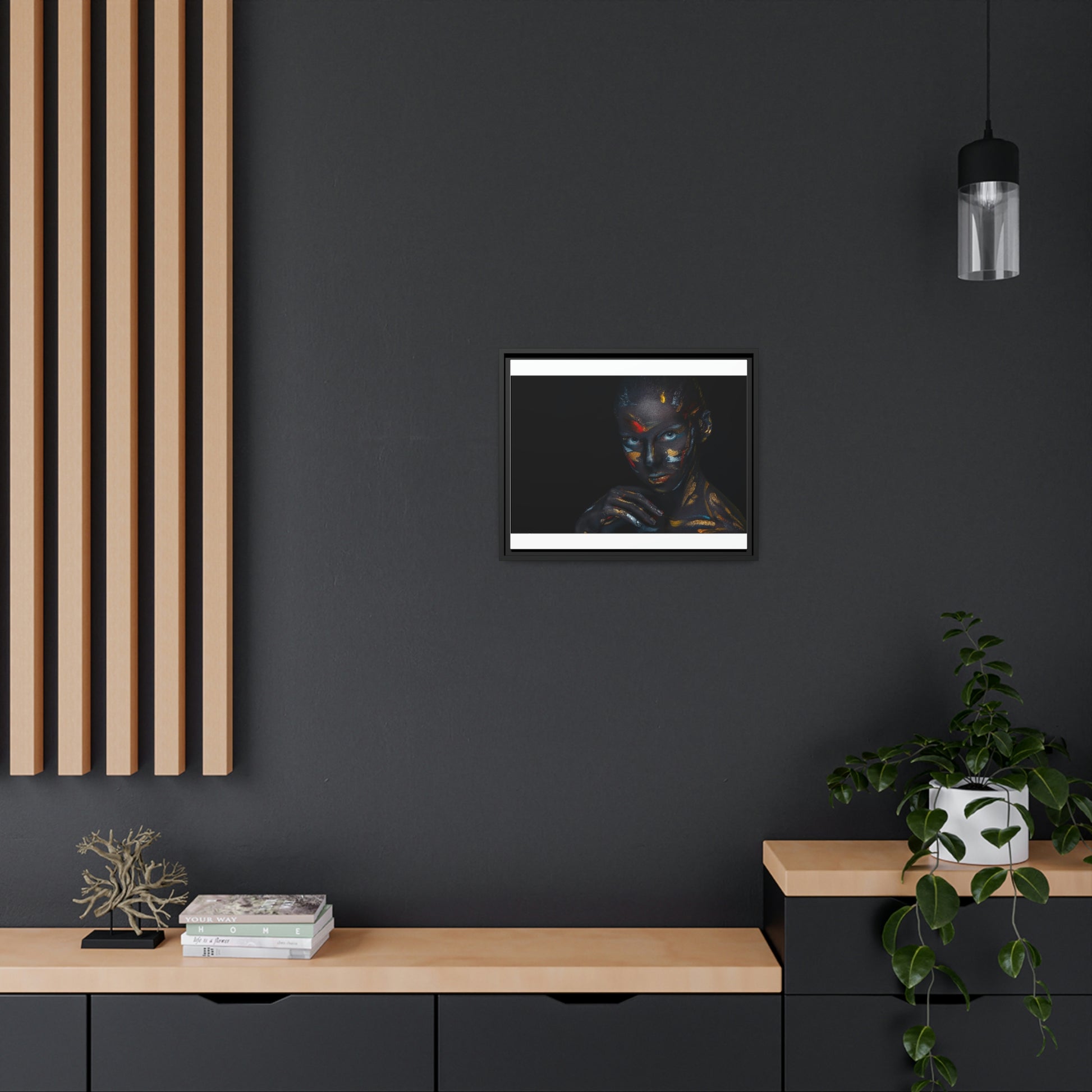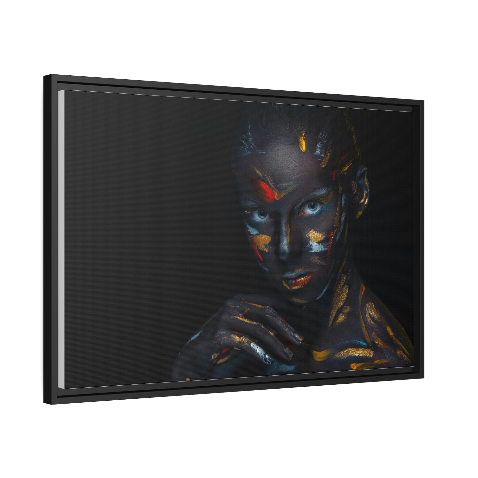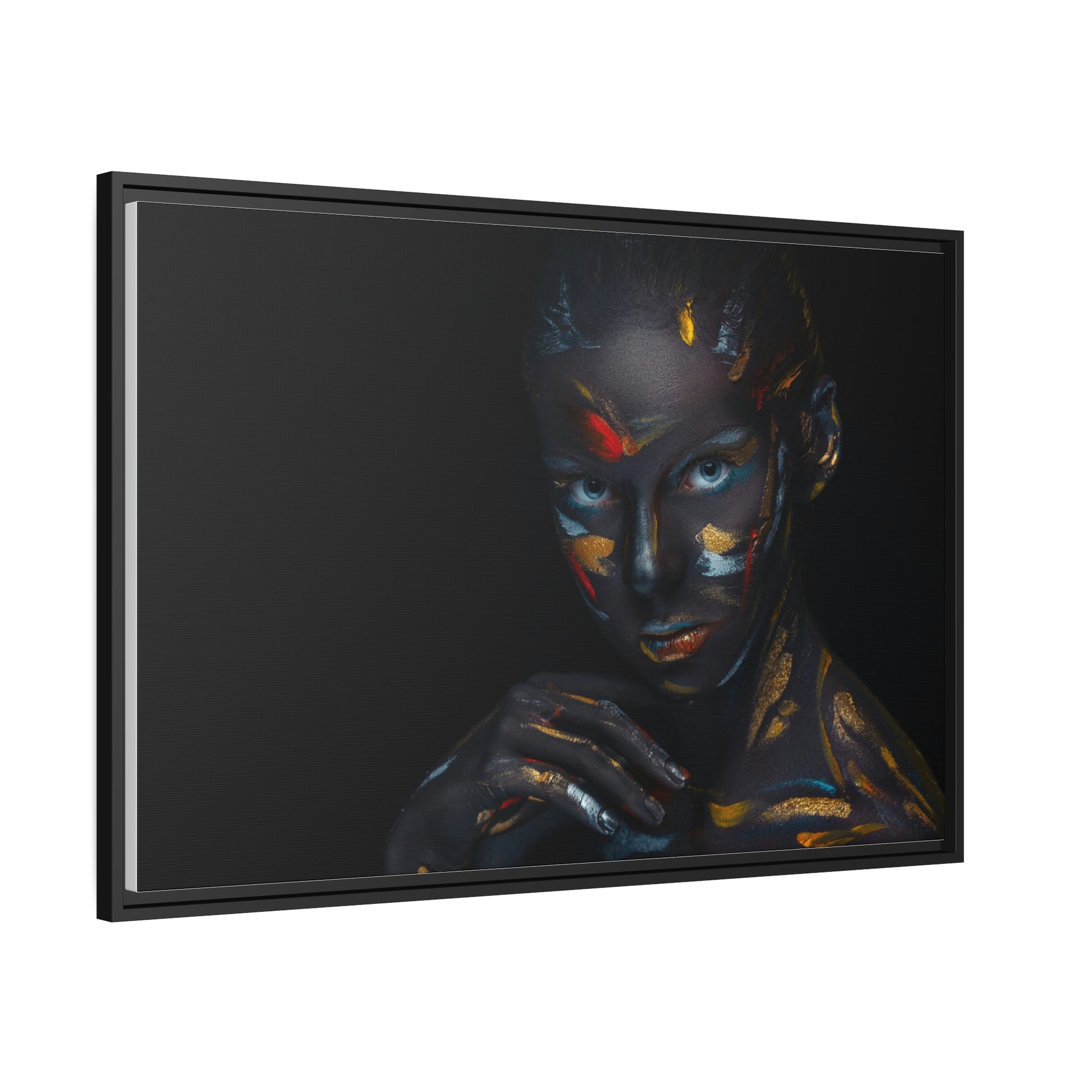 Transform any room into an artistic space with this stunning Framed Canvas Photo Portrait titled "Inky Enigma". This unique piece of Wall Art features a young woman posing elegantly, yet mysteriously, covered in black paint. Her piercing gaze draws you into the image, leaving you captivated by her enigmatic aura.