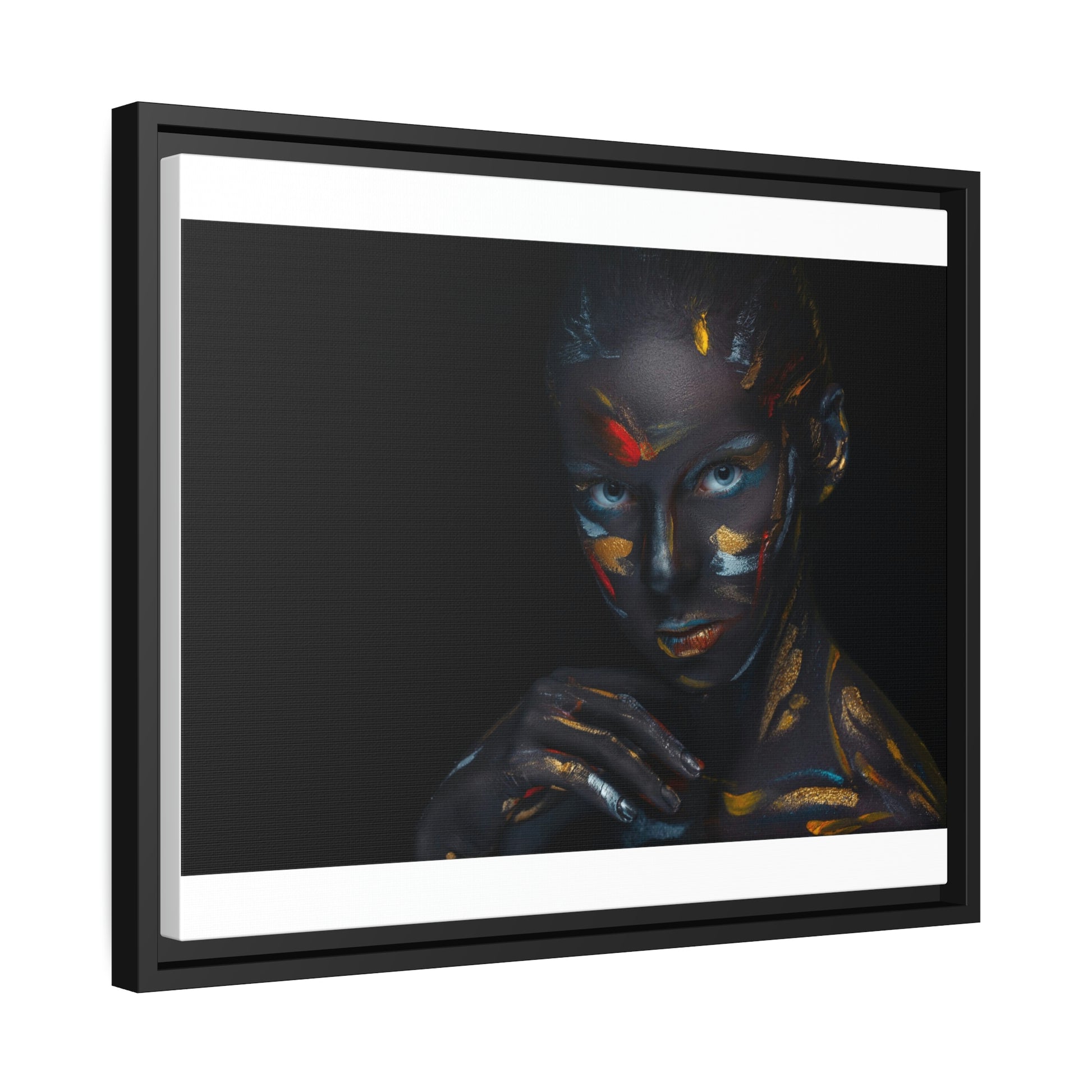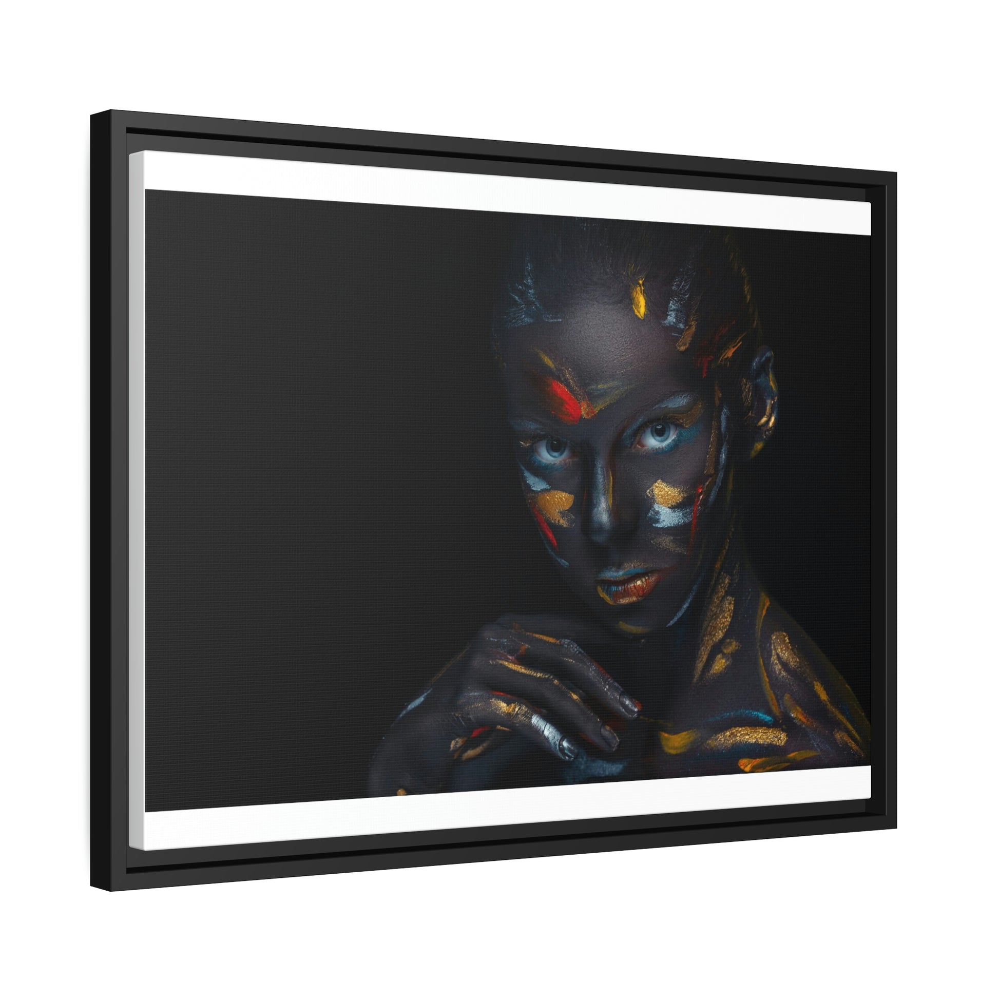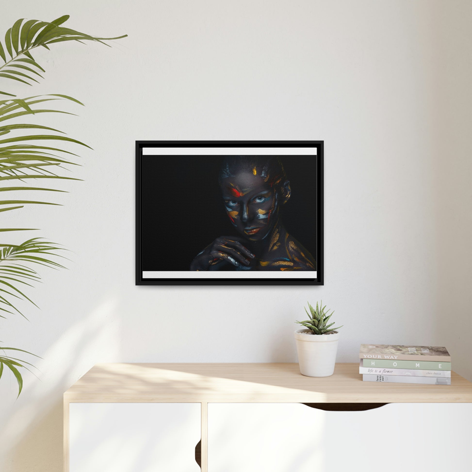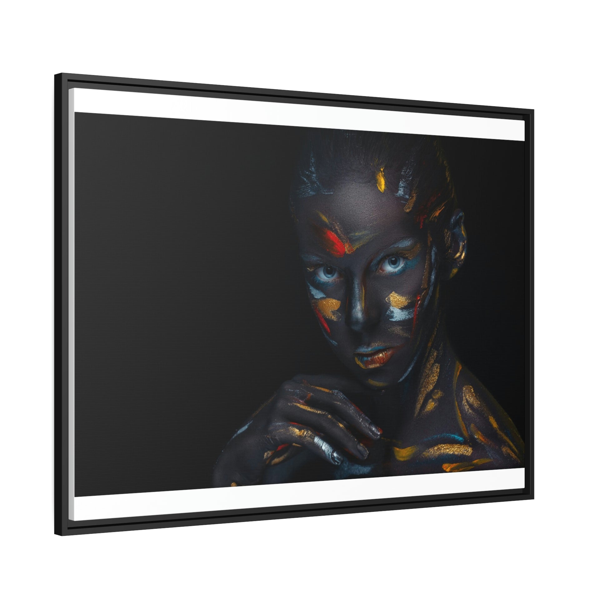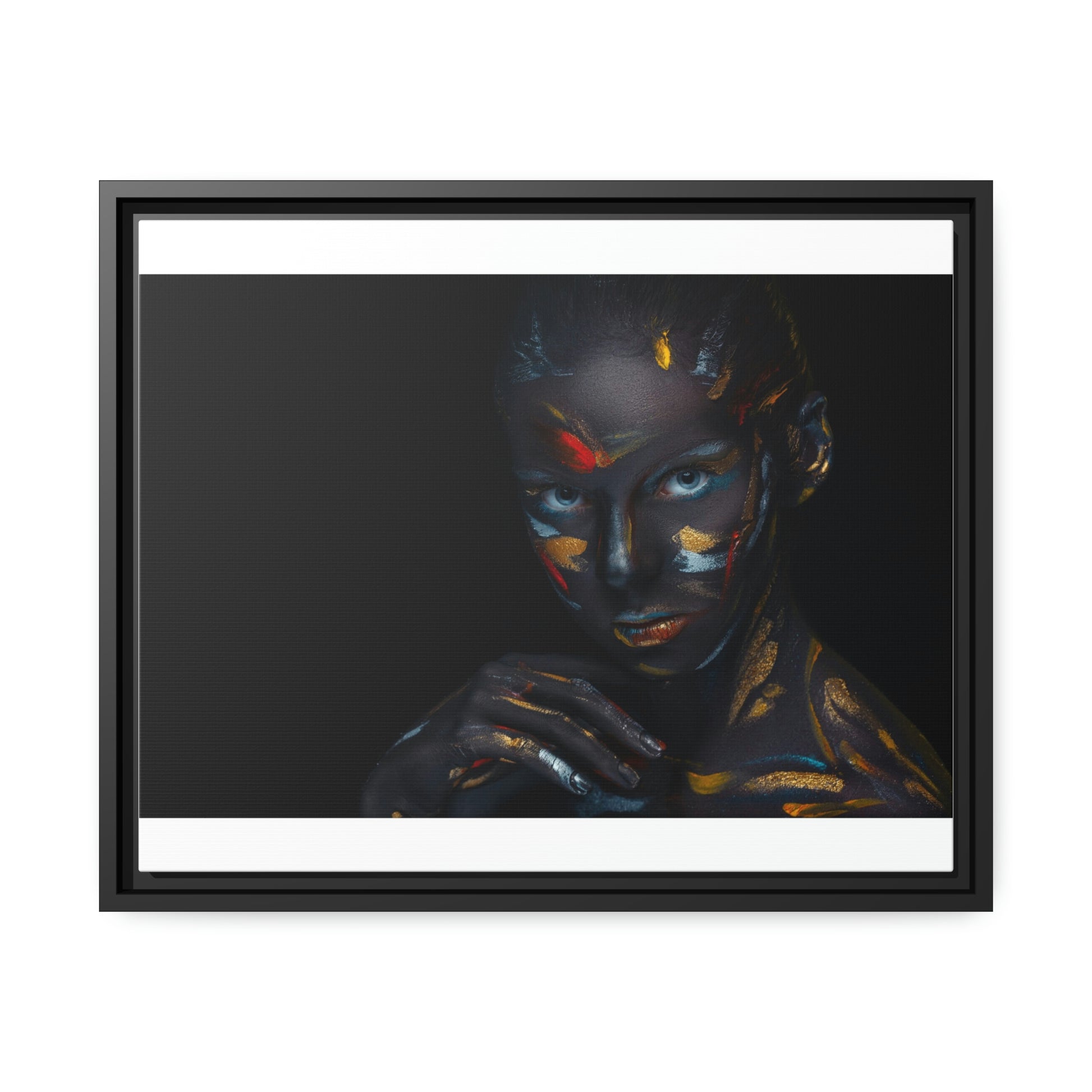 Transform any room into an artistic space with this stunning Framed Canvas Photo Portrait titled "Inky Enigma". This unique piece of Wall Art features a young woman posing elegantly, yet mysteriously, covered in black paint. Her piercing gaze draws you into the image, leaving you captivated by her enigmatic aura.