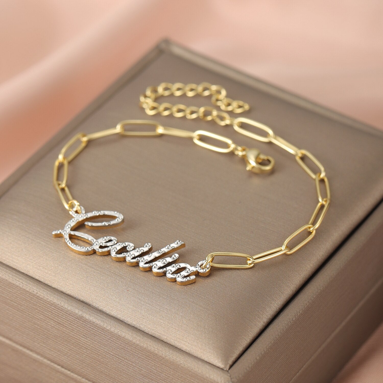 In conclusion, our Minimalist Paper Clip Chain Custom Nameplate Bracelet for Women is a special piece of jewelry that combines elegance, simplicity, and personalization. Whether you wear it for yourself or gift it to someone special, it serves as a beautiful reminder of identity and emotional connection. Embrace your individuality and add a touch of personal charm with this exquisite nameplate bracelet.