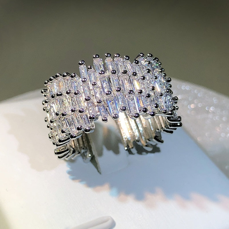 This ring is made with a 925 sterling silver base, which is durable and resistant to tarnishing, and plated with real solid 14K white gold for a luxurious finish. The geometric pattern and prong setting add a touch of elegance and sophistication, making this ring perfect for any occasion, especially weddings and parties.