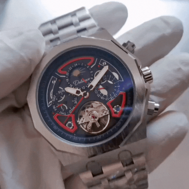 Enhancing visibility in different lighting conditions, the luminous feature, combined with an auto date, complete calendar, and moon phase, contributes to both functionality and aesthetics.