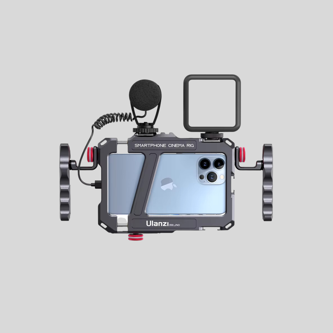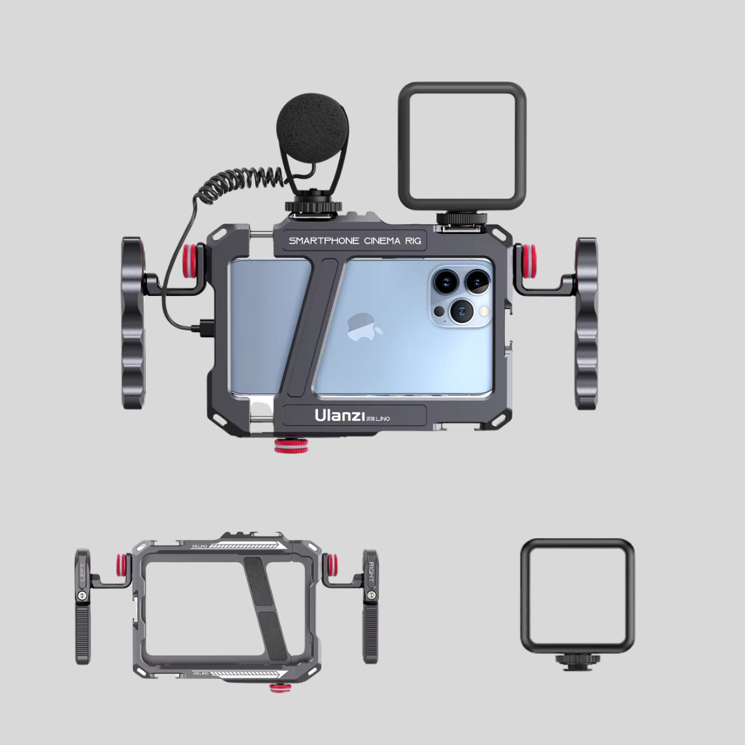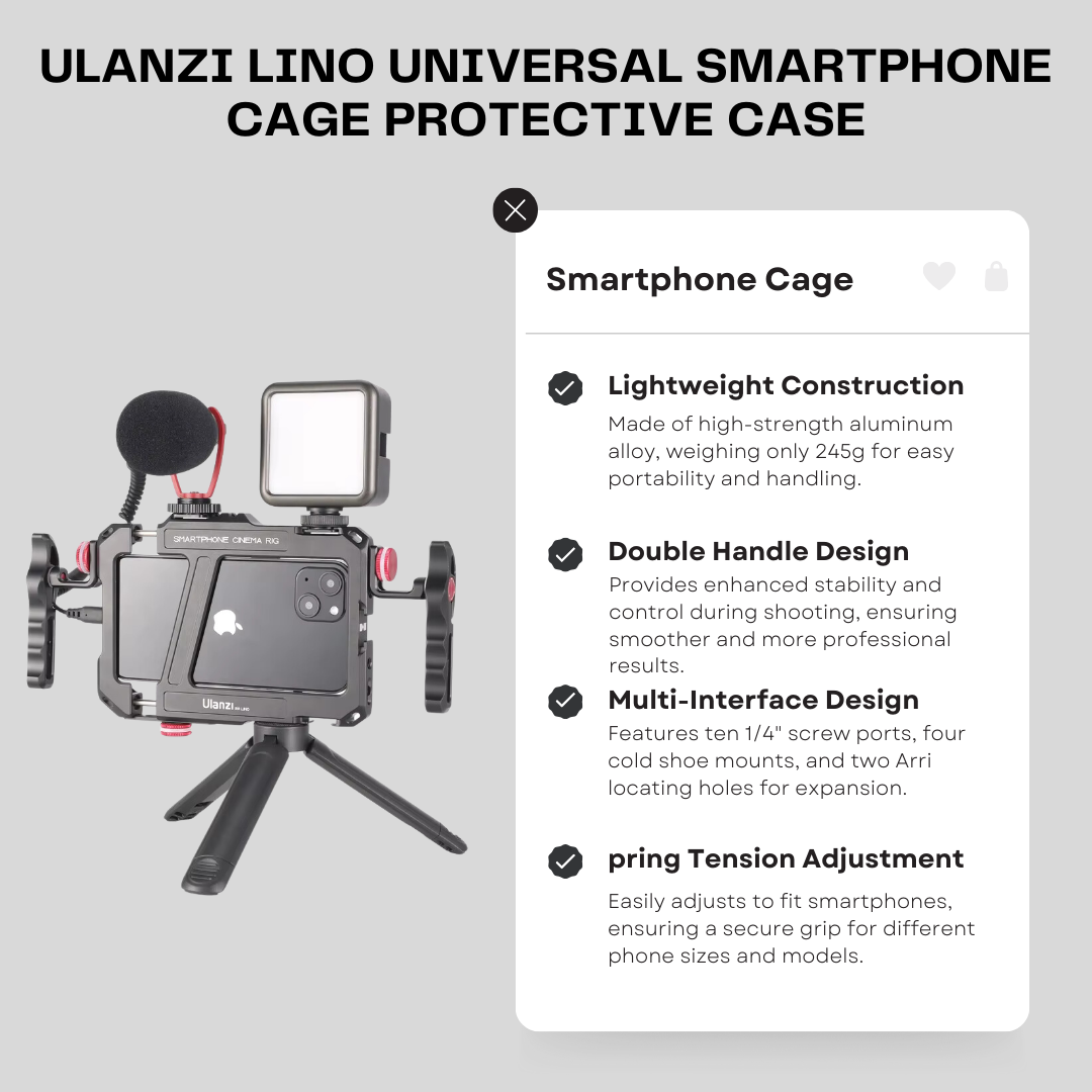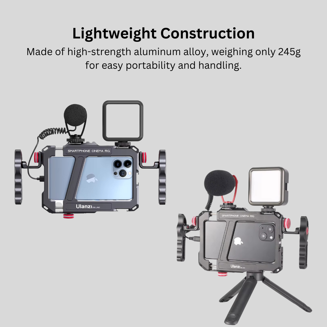 The Ulanzi Lino Vlog Kit is a lightweight and versatile photography accessory designed for smartphone videography. Weighing only 245g, it features a durable aluminum alloy construction for easy portability. The rig accommodates smartphones with widths ranging from 5.4" to 6.7" and includes spring tension adjustment for compatibility with iPhone 13 mini, iPhone 13 Pro Max, and Android phones. Its double handle design ensures stable shooting, while the adjustable handle angle provides a better grip for precise control. With multiple interfaces, including ten 1/4" screw ports, four cold shoe mounts, and two Arri locating holes, the Lino offers extensive expansion options for various accessories, making it an essential tool for any content creator.