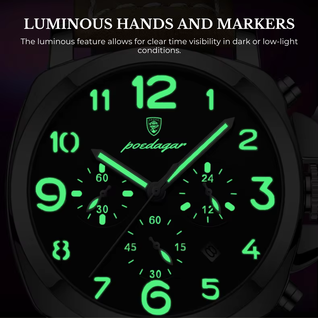 Luminous Hands: Easily readable in low-light conditions, thanks to its luminous hands and markers.