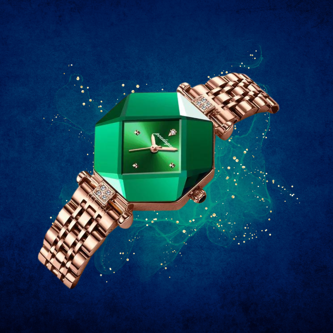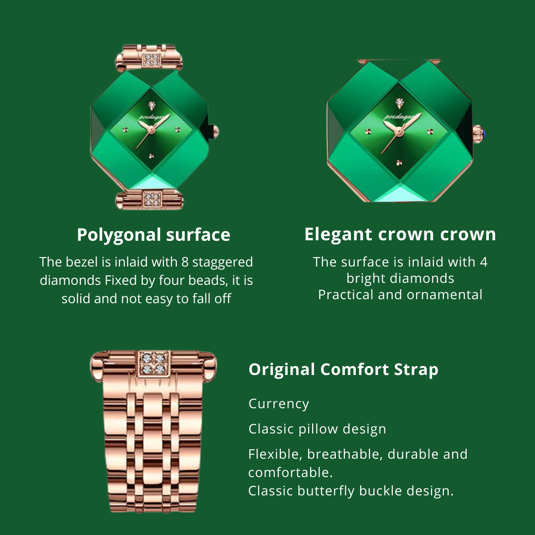 Elegant Design: Features a luxurious green diamond dial and an irregular-shaped case for a modern, stylish look.
