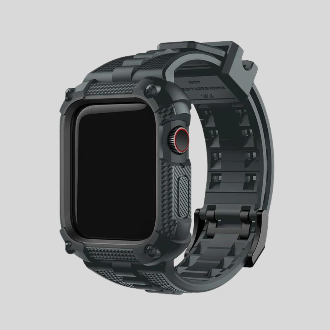 The Fullmosa Military-Style Apple Watch Band is designed for durability and protection, crafted from premium silicone with perforated holes for breathability and comfort. This rugged band, compatible with Apple Watch models Ultra, Series 9, 8, 7, 6, 5, 4, and SE, features a dual thorn buckle and a TPU+PC hard plastic casing for ultimate shock protection. It also comes with a free PET 3D hot bending screen protector to ensure your watch remains safe from scratches and bumps. The band allows for effortless access to wireless charging without removing the case, offering a secure fit and complete protection for your Apple Watch. The package includes a bumper case, three screen protectors, and an installation toolkit for easy setup.