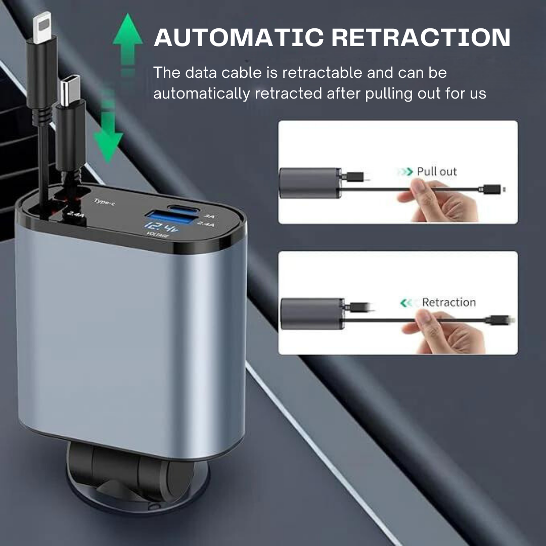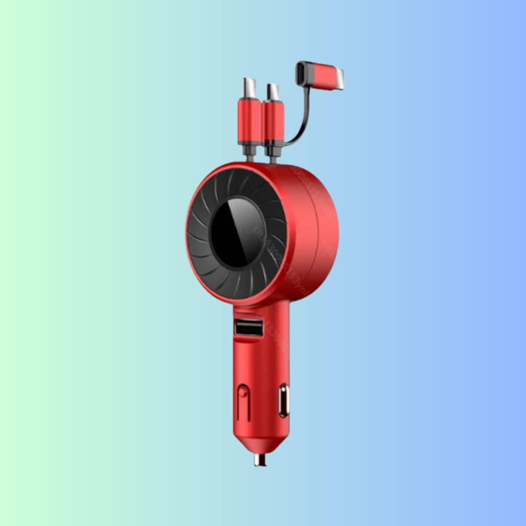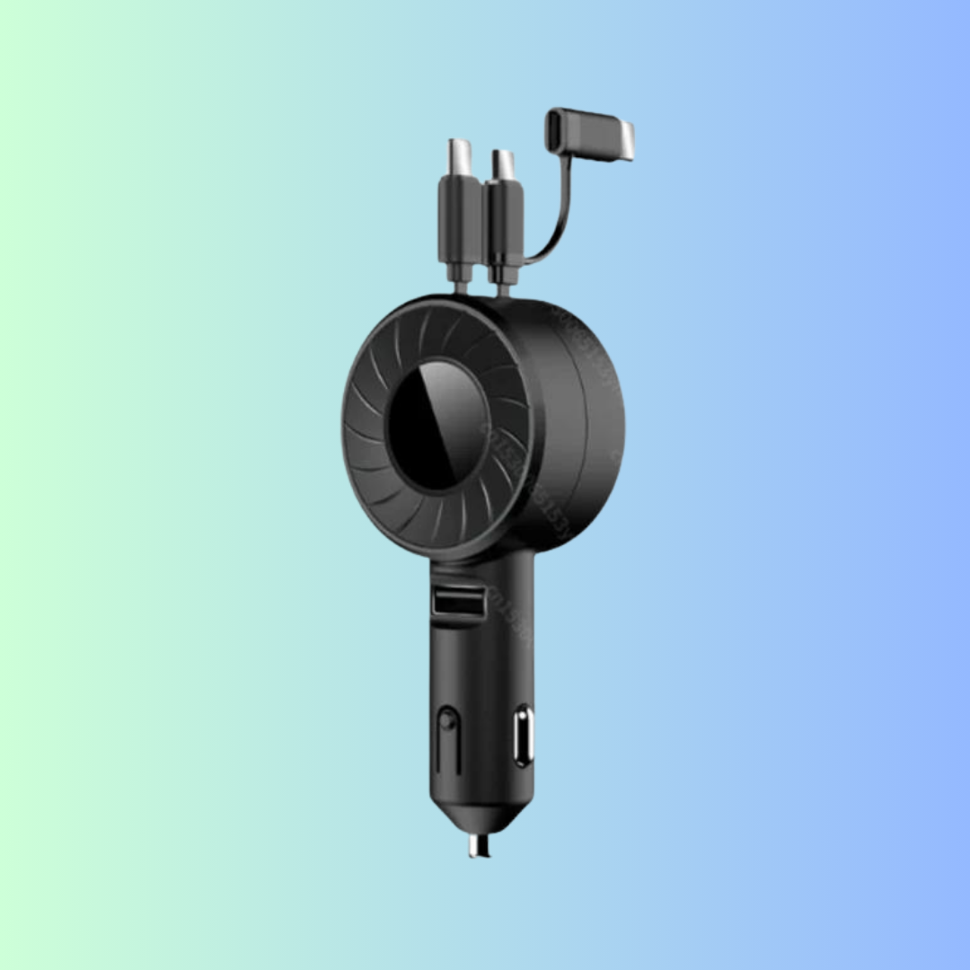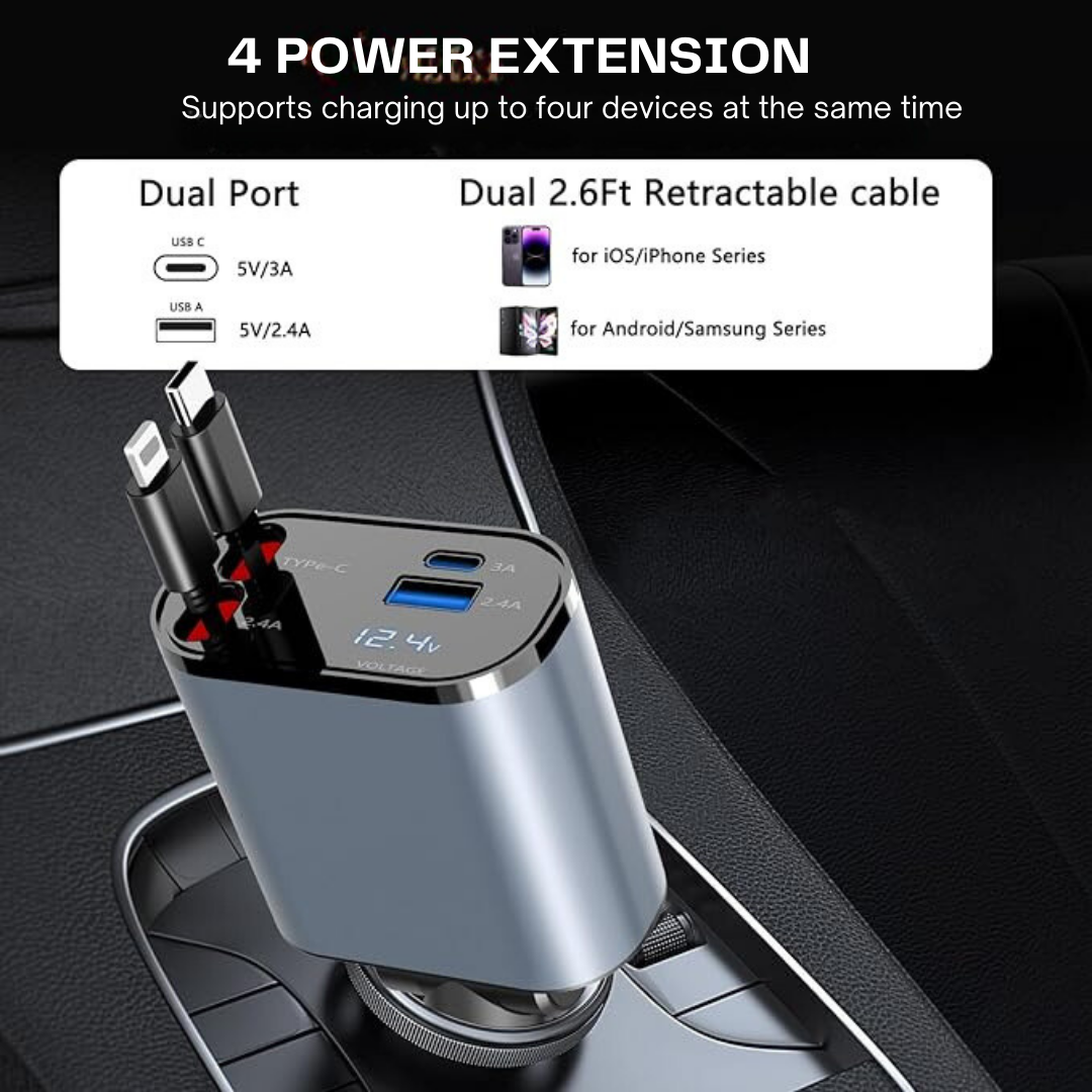 Our car fast charger boasts dual USB ports and a telescopic cable interface, enabling simultaneous charging of multiple devices on the go.