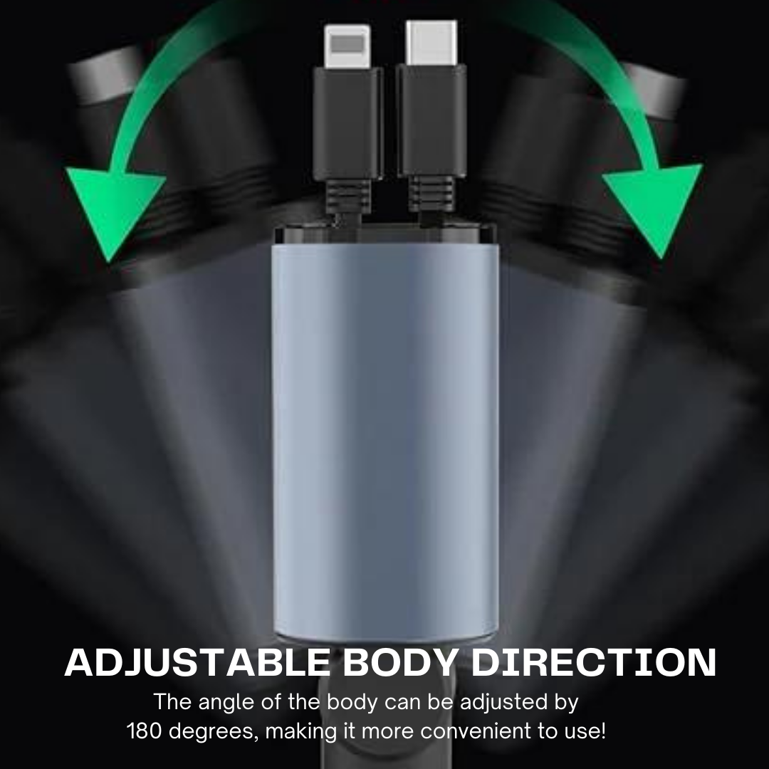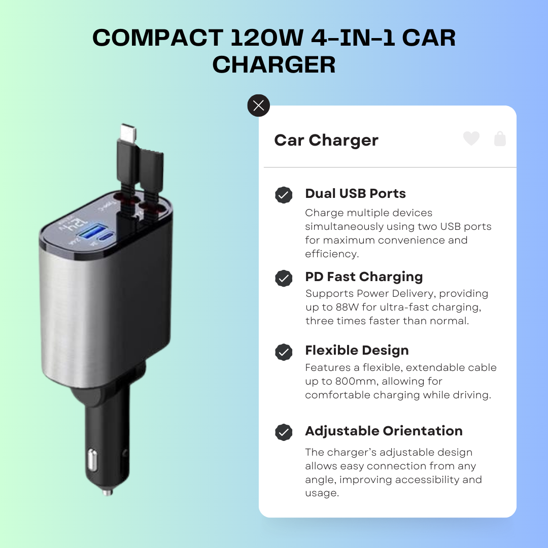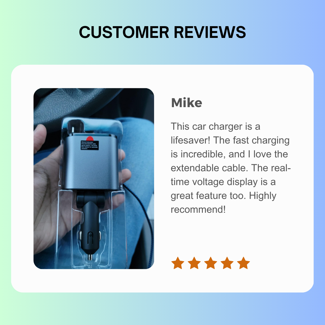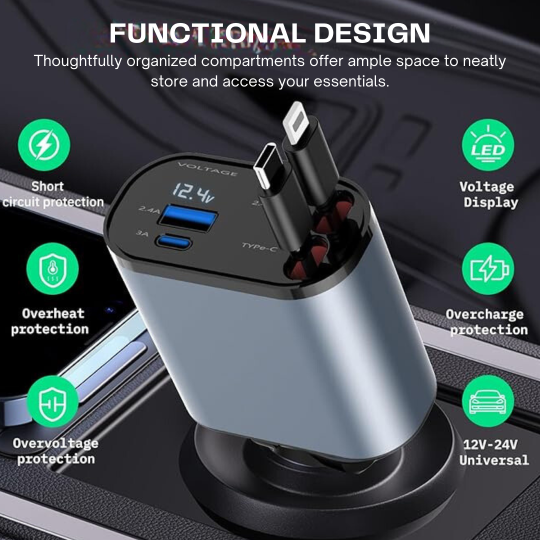 Our car fast charger boasts dual USB ports and a telescopic cable interface, enabling simultaneous charging of multiple devices on the go.