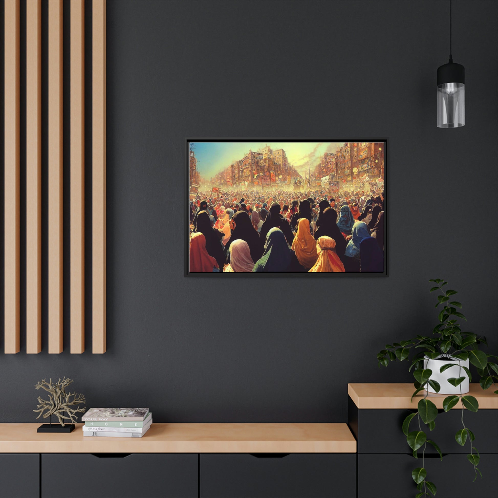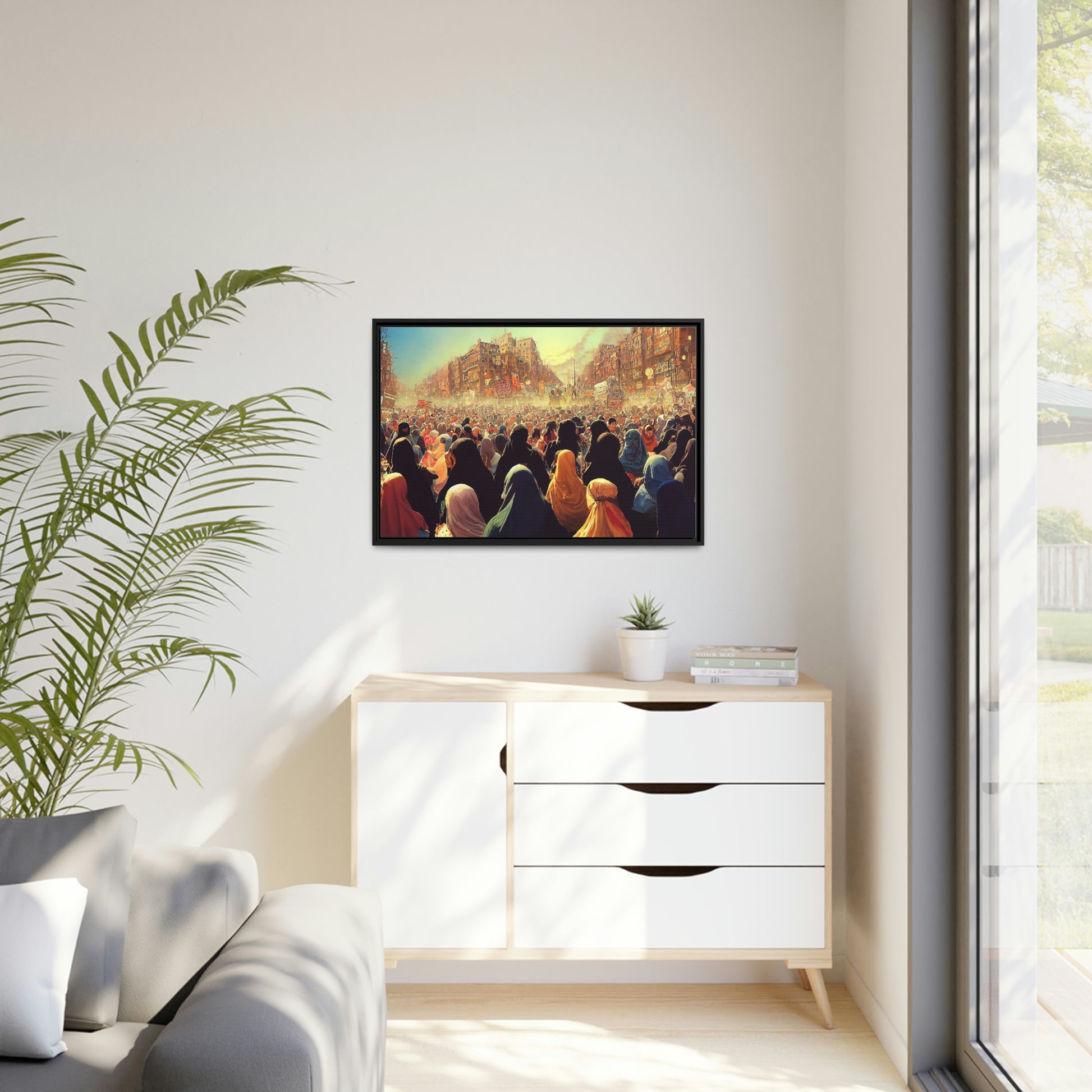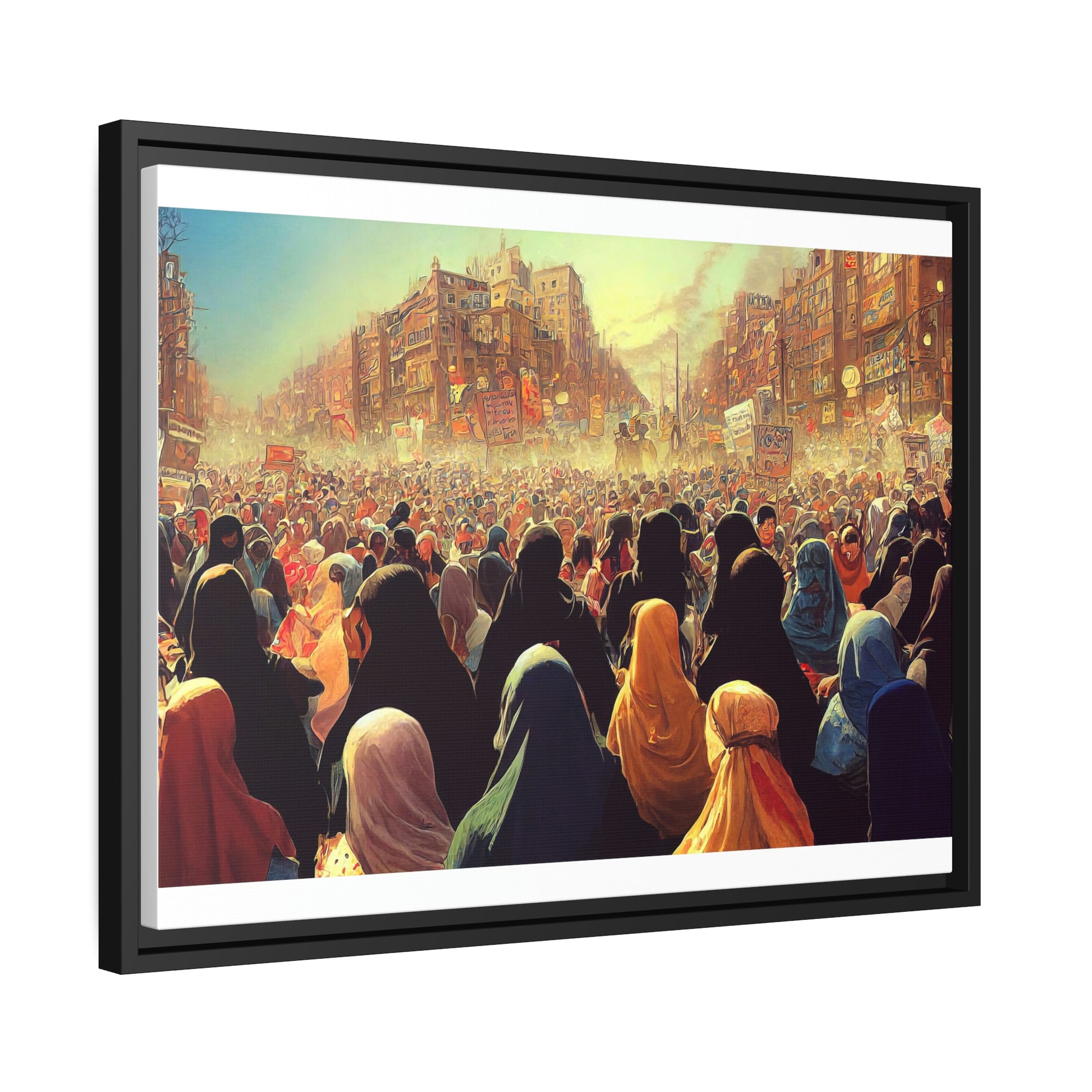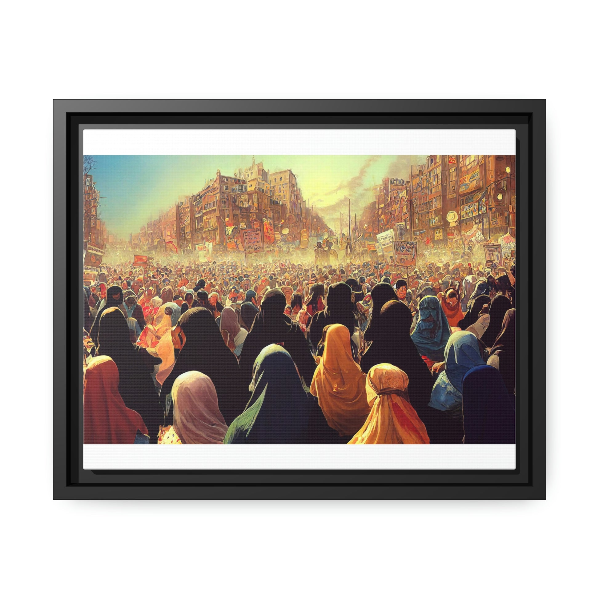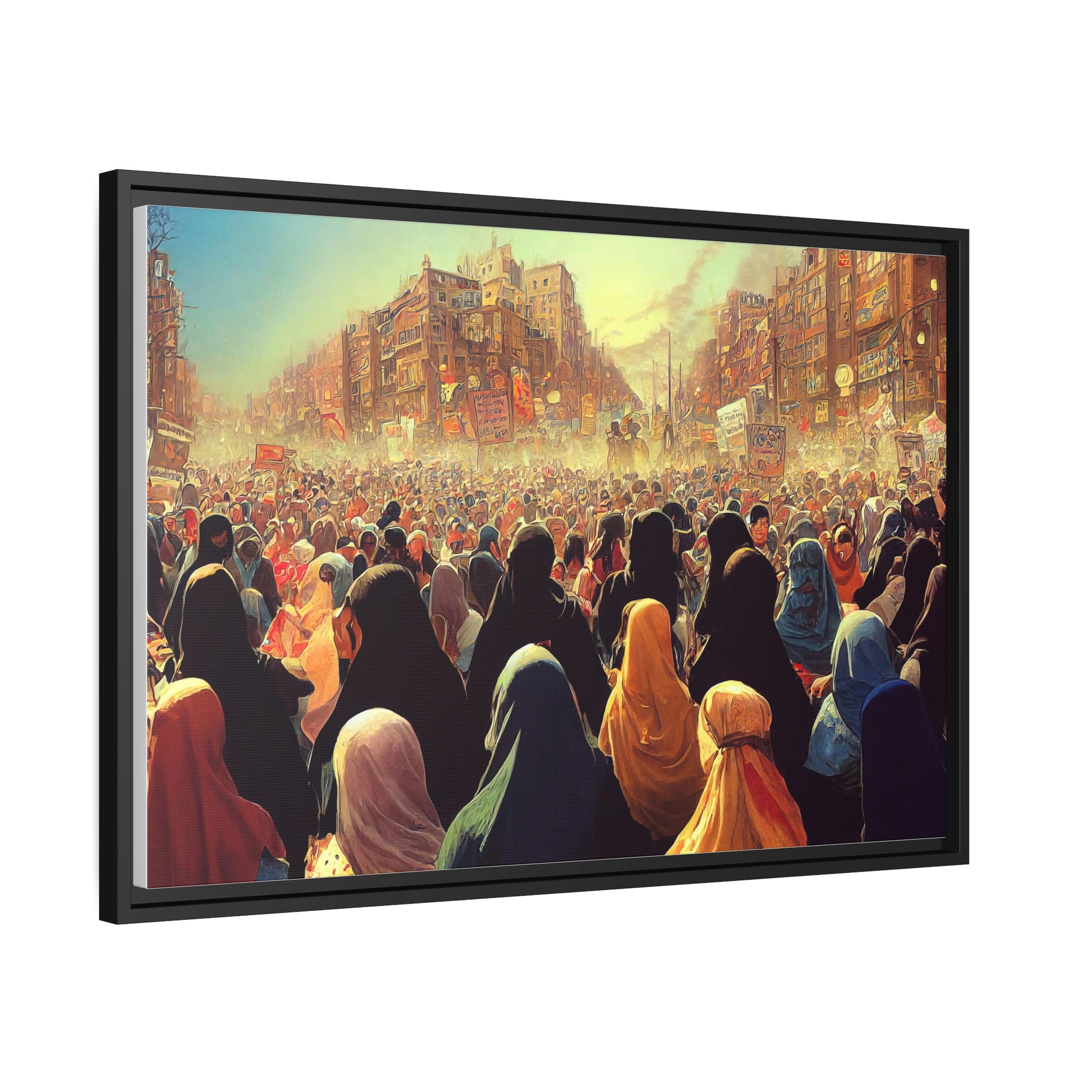 Add a touch of inspiration and activism to your walls with this beautifully crafted framed canvas abstract illustration of women's freedom protests in Iran. This wall art features a stunning representation of the brave women who have been fighting for their rights and freedoms in Iran, depicted through a combination of bold and vibrant colors and abstract shapes.