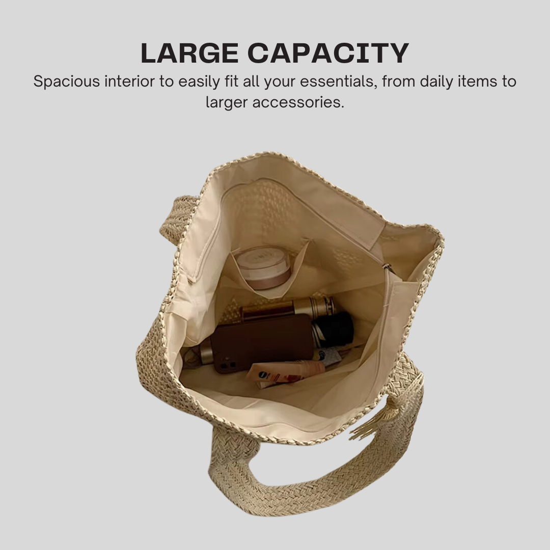 This stylish, hand-woven shoulder bag is crafted from high-quality straw, making it both lightweight and durable for everyday use. Its casual tote shape offers a soft structure, perfect for versatile occasions like shopping, beach trips, or casual outings. The solid color design, adorned with a chic tassel, adds a touch of elegance to its fashion-forward style. With two sturdy handles, it provides ample space for your essentials while maintaining a sleek and simple look. The secure zipper closure ensures your belongings stay safe, even without an interior pocket, making it a practical yet fashionable choice for women on the go.