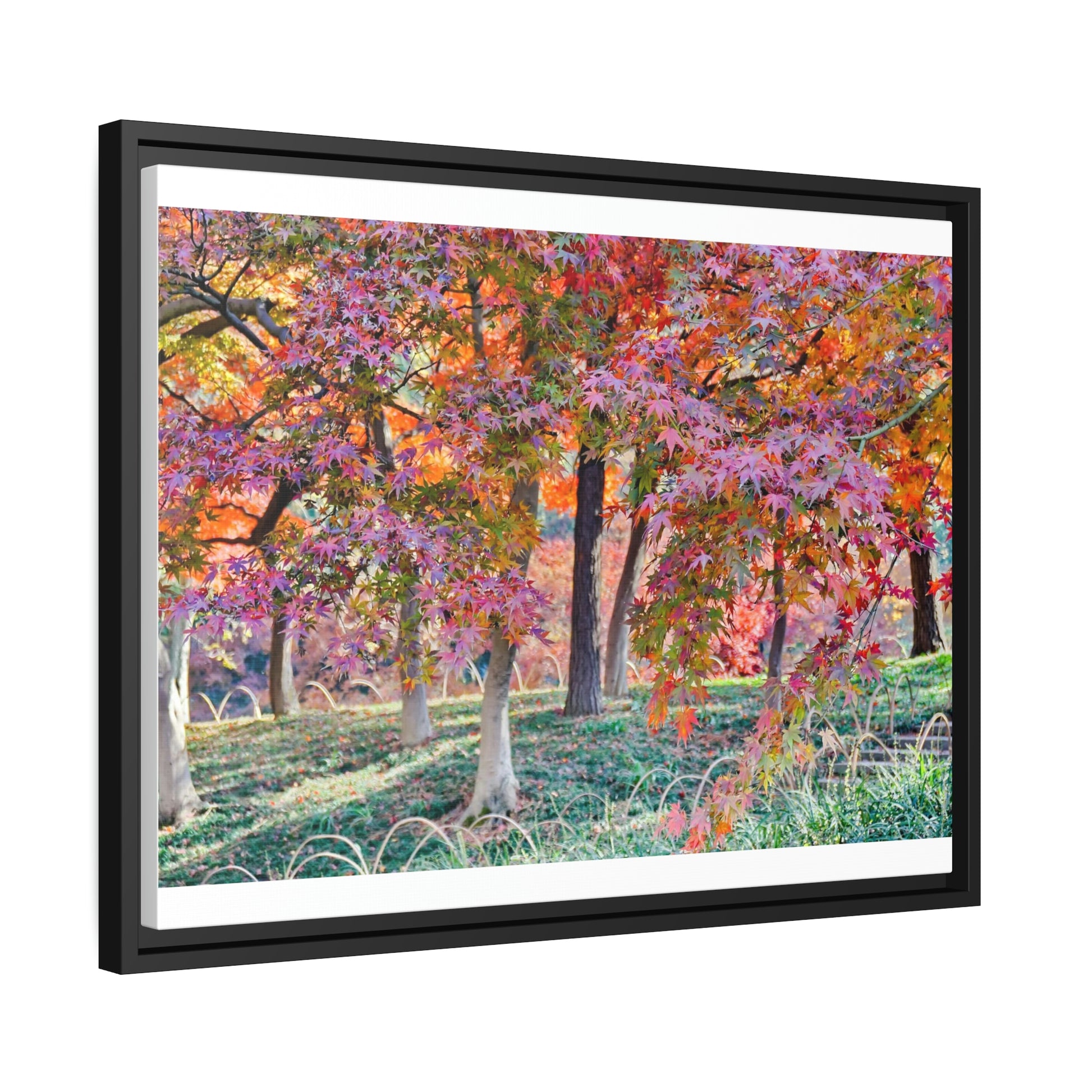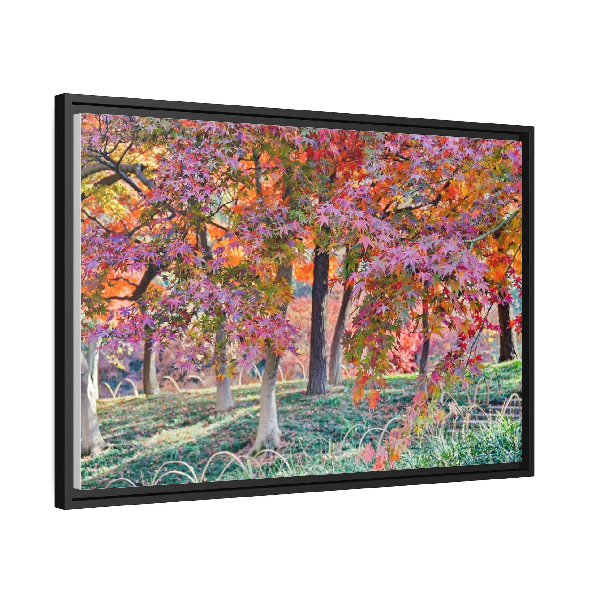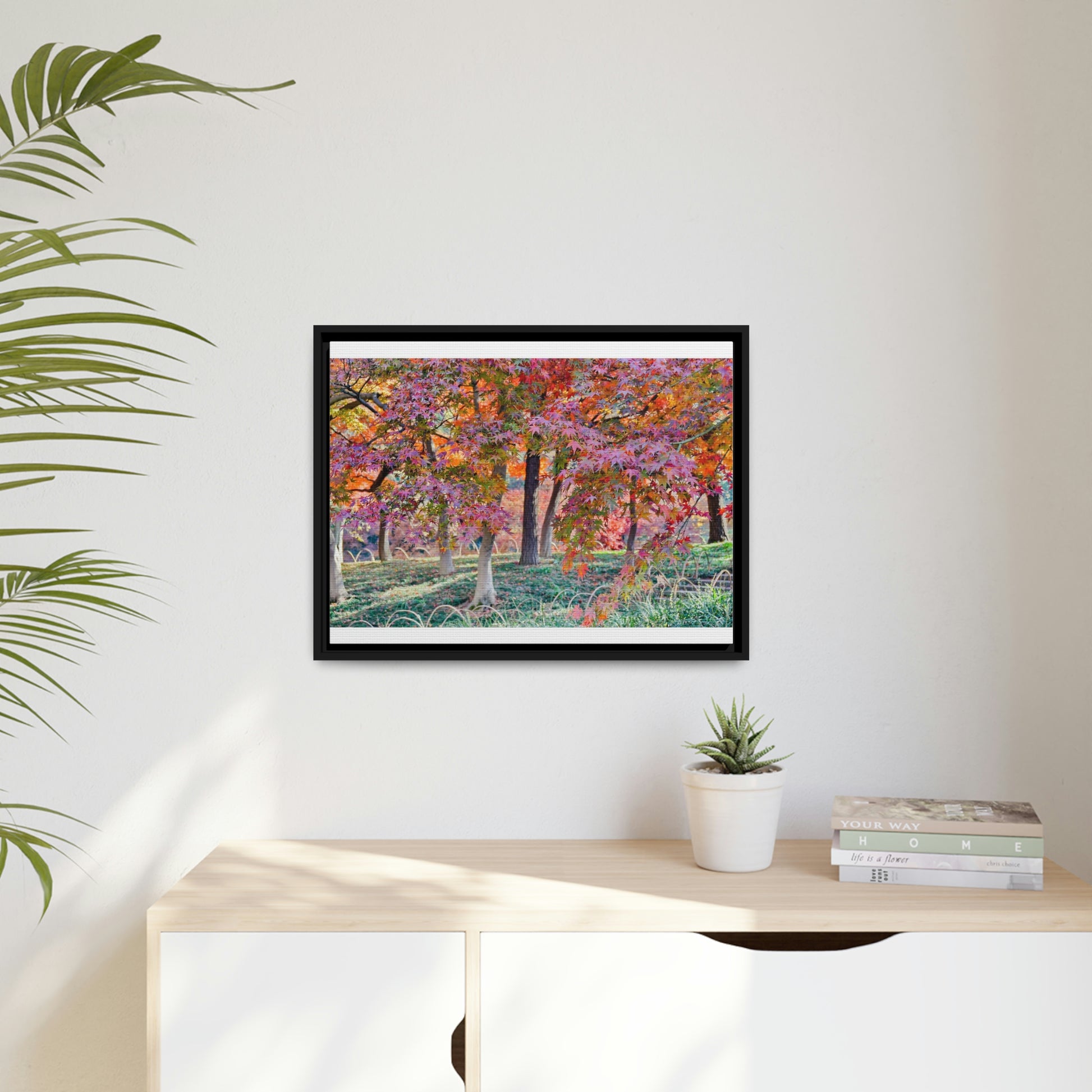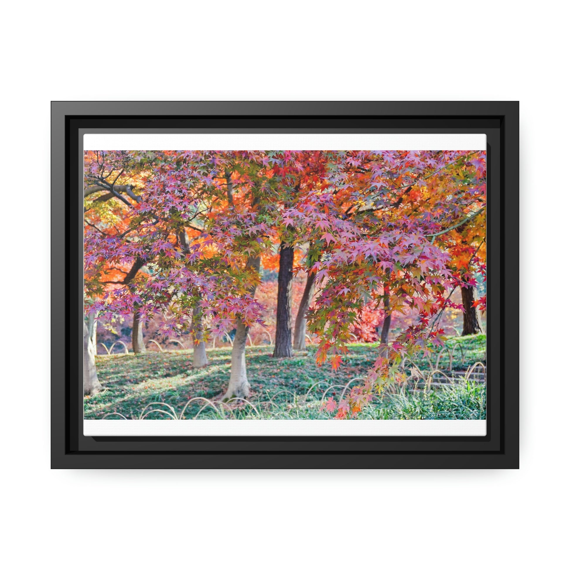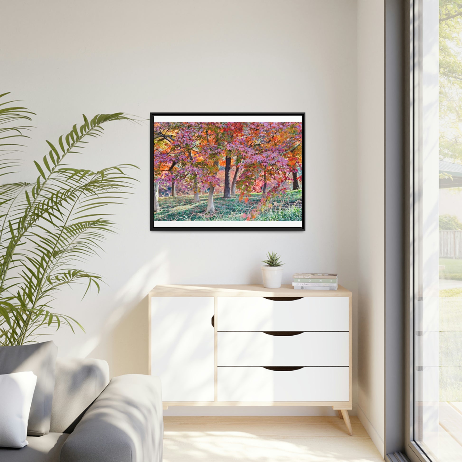 Sun-kissed Foliage" - Vibrant Framed Canvas Wall Art of Colourful Leaves on Trees in Sunlight