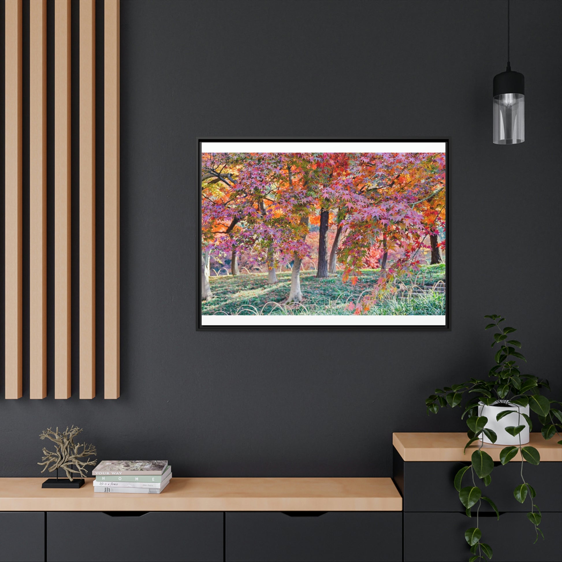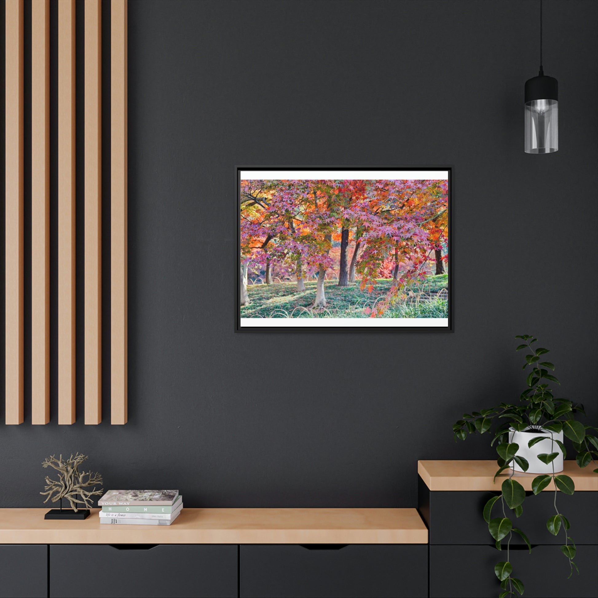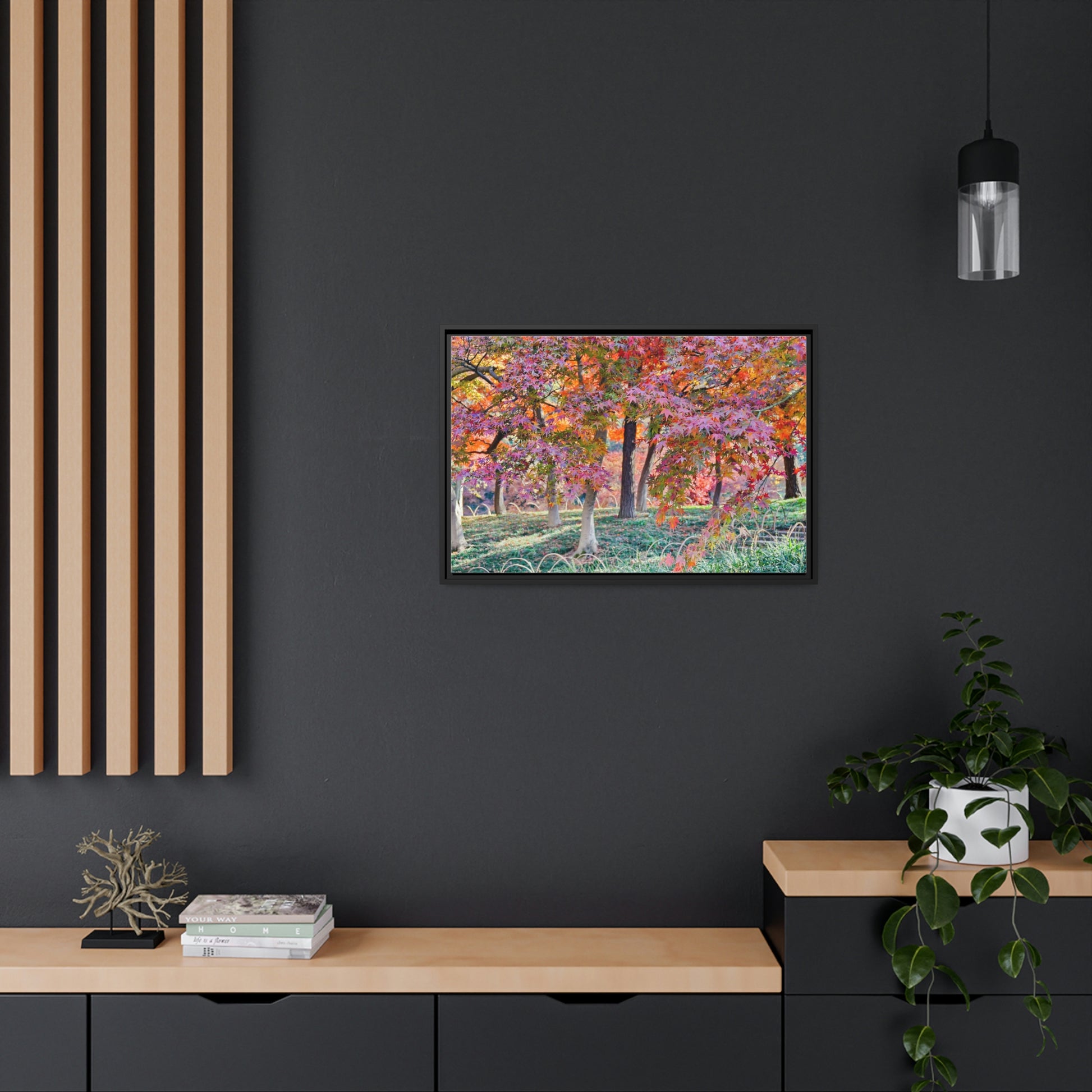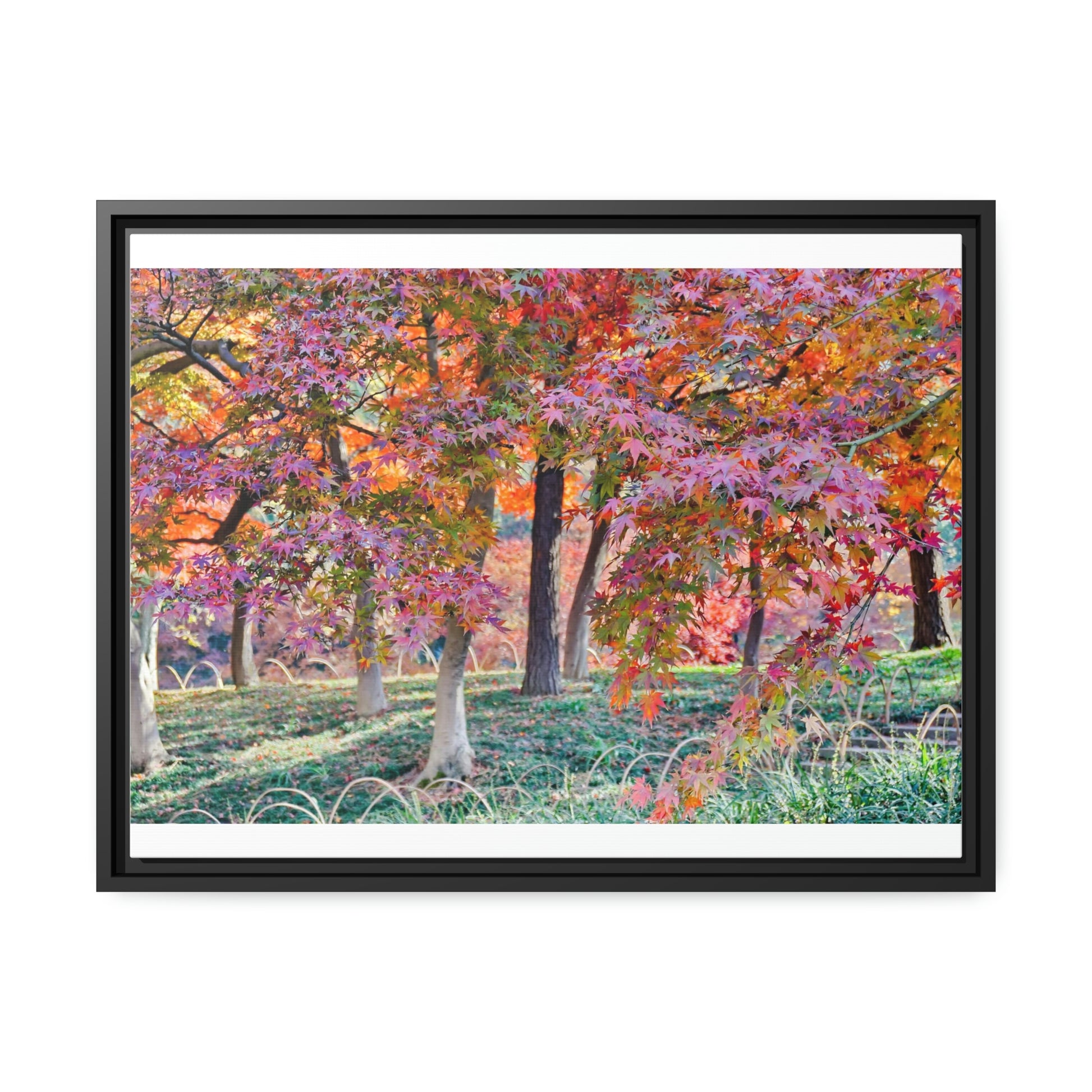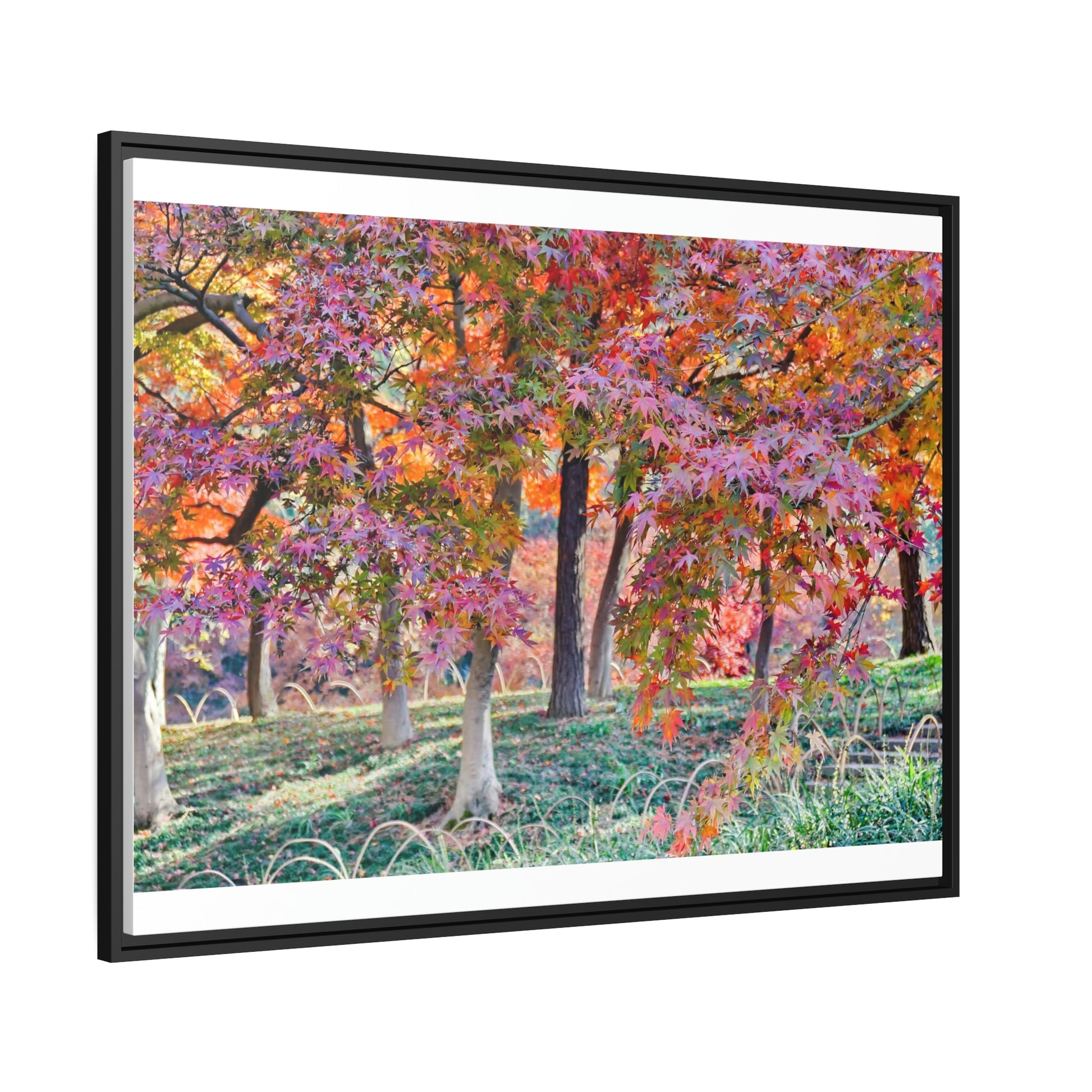 Sun-kissed Foliage" - Vibrant Framed Canvas Wall Art of Colourful Leaves on Trees in Sunlight