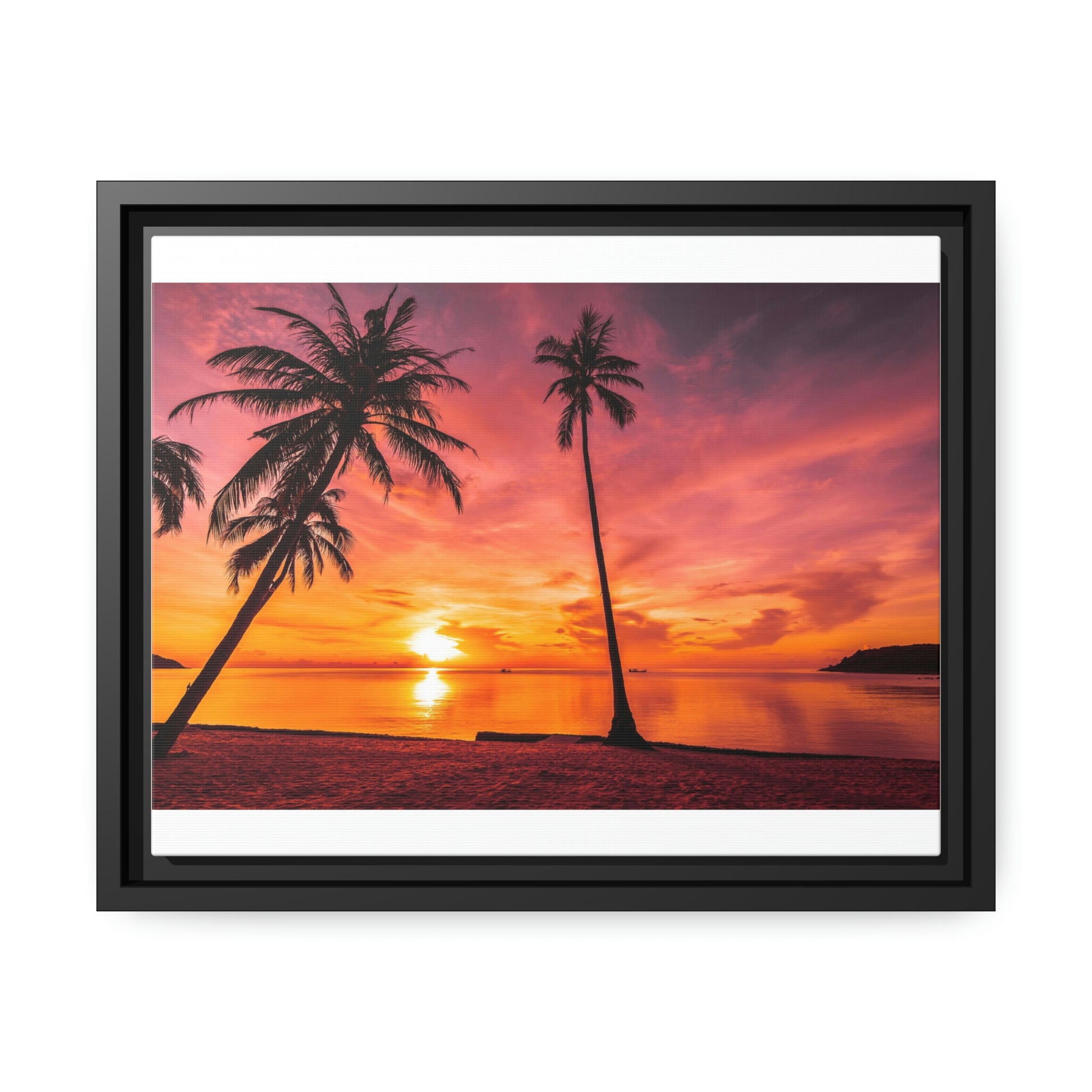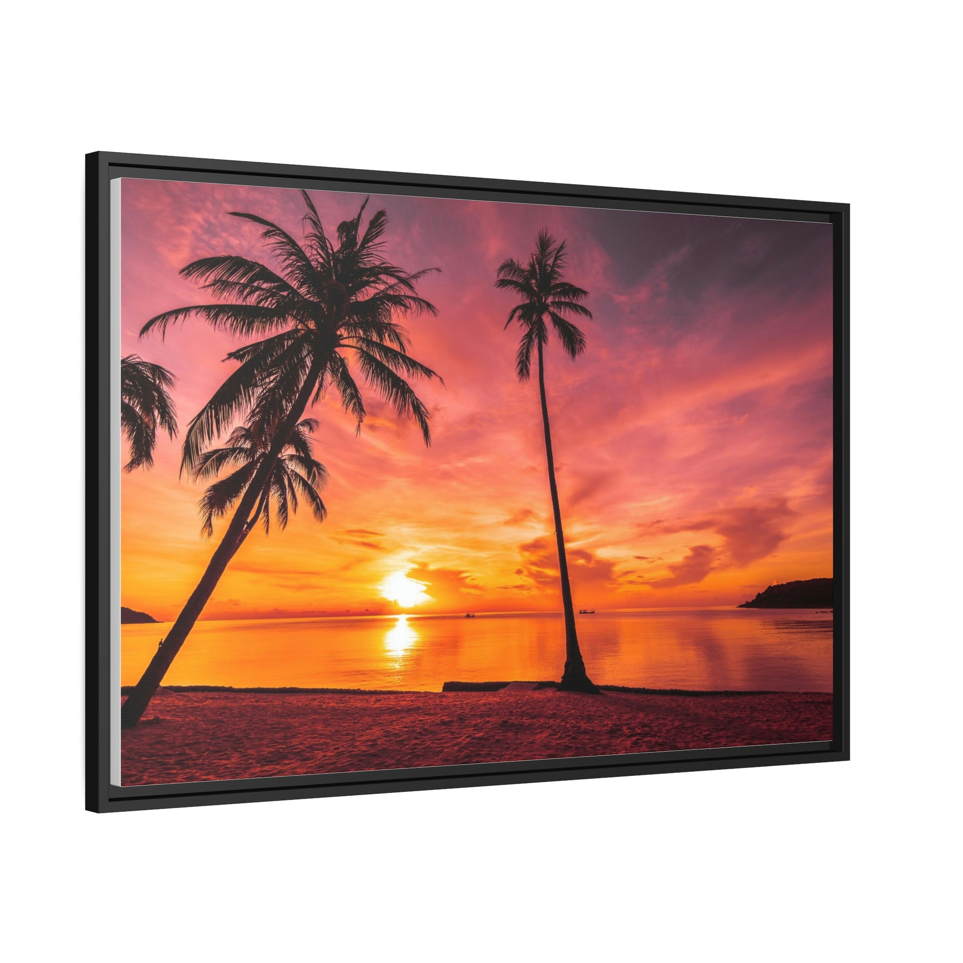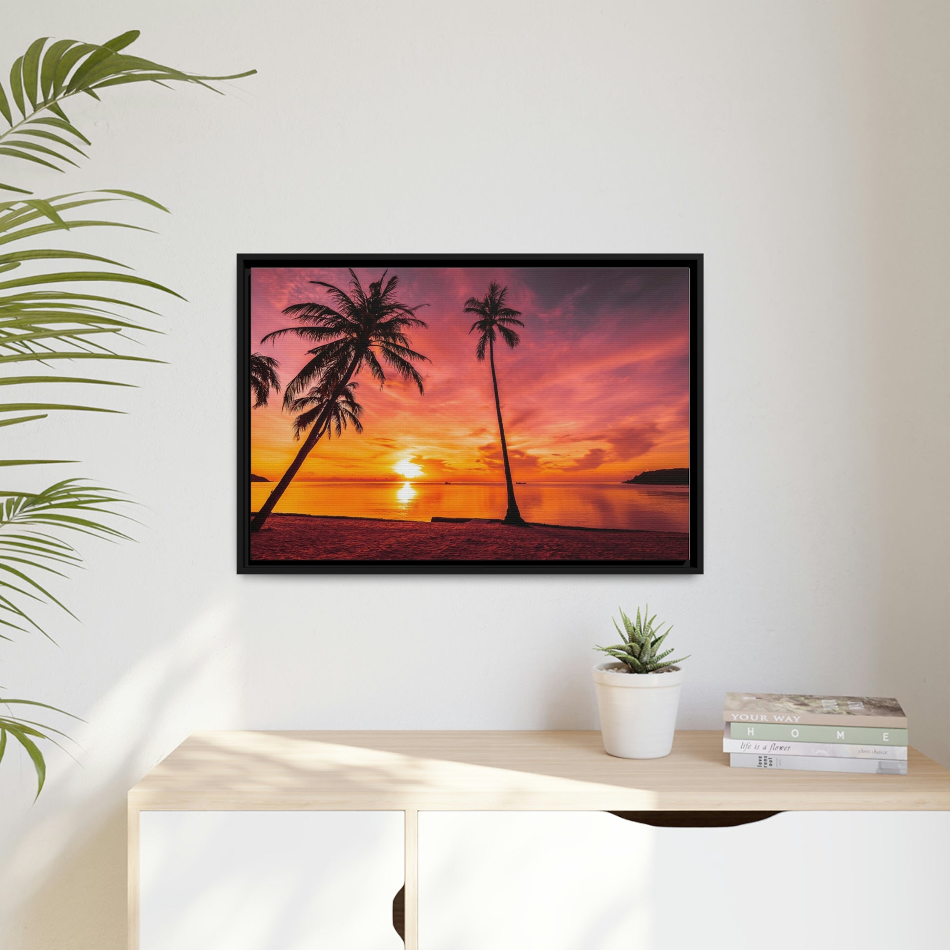 Tropical Serenity: Sunset Time Canvas Wall Art with Coconut Palm-Tree in Black Frame